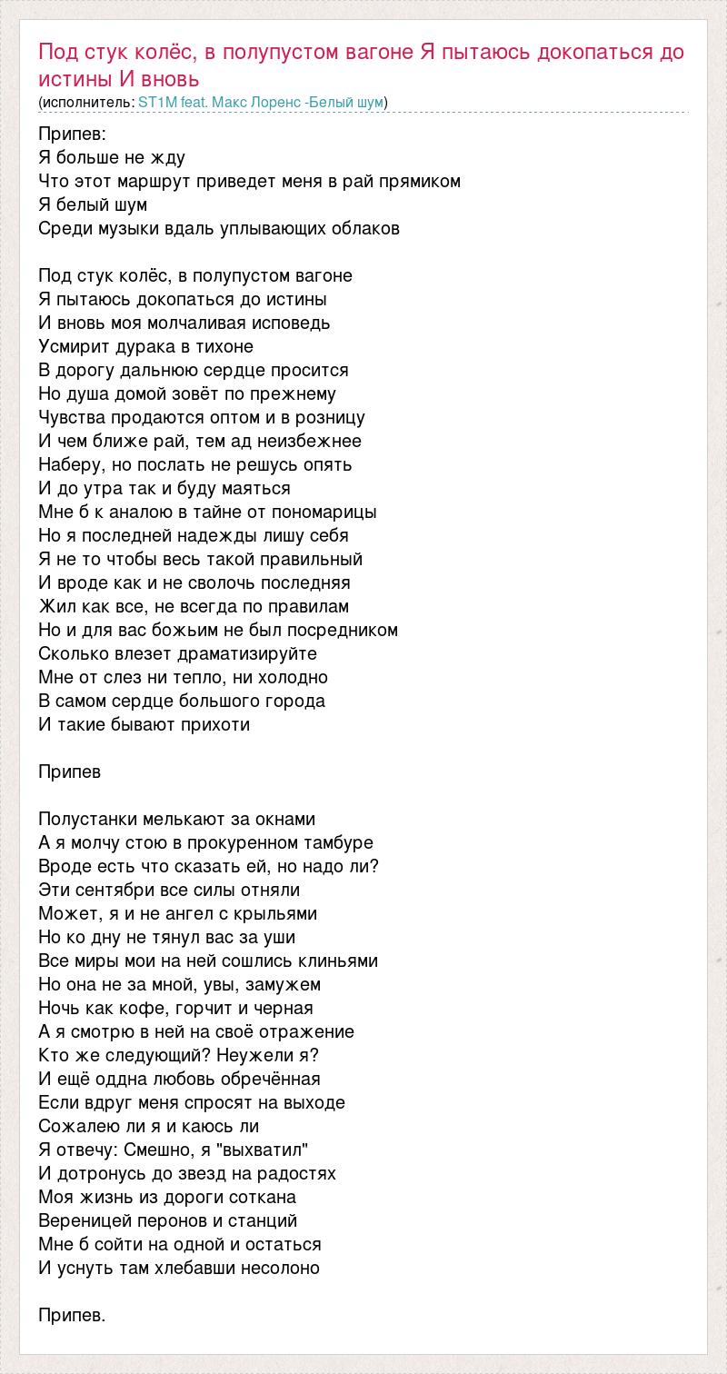 Главная→Исполнители→ST1M feat. Макс Лоренс -Белый шум→Под стук колёс, в полупустом вагоне Я пытаюсь докопаться до истины И вновь