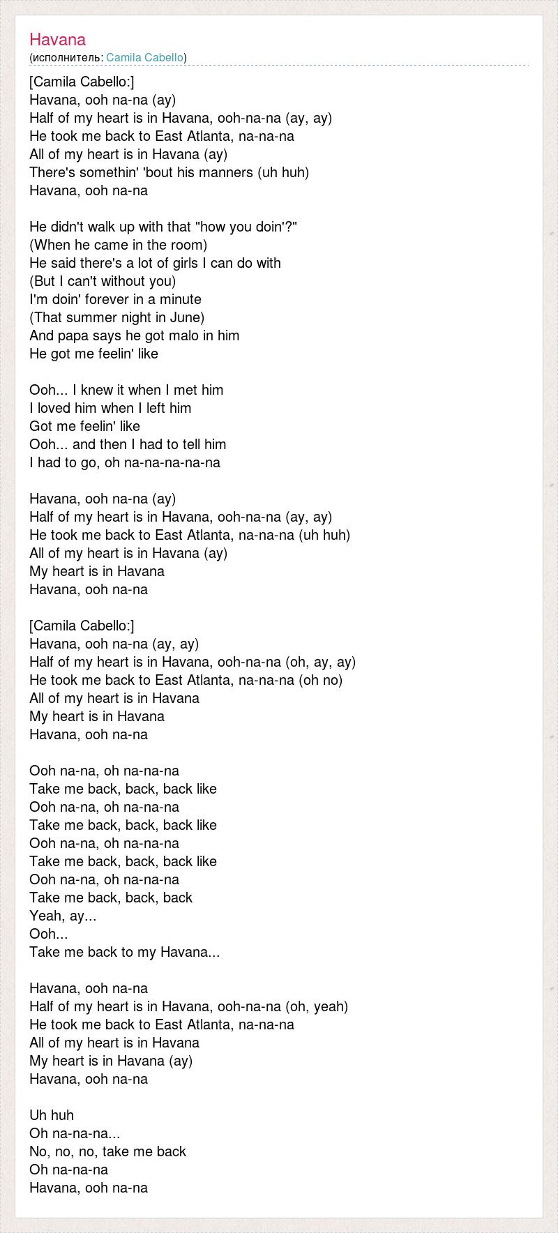 [Camila Cabello:] Havana, ooh na-na (ay) Half of my heart is in Havana, ooh-na-na (ay, ay) He took me back to East Atlanta, na-na-na All of my heart is in Havana (ay) There's somethin' 'bout his manners (uh huh) Havana, ooh na-na He didn't walk up with that "how you doin'?" (When he came in the room) He said there's a lot of girls I can do with (But I can't without you) I'm doin' forever in a minute (That summer night in June) And papa says he got malo in him He got me feelin' like Ooh... I knew it when I met him I loved him when I left him Got me feelin' like Ooh... and then I had to tell him I had to go, oh na-na-na-na-na Havana, ooh na-na (ay) Half of my heart is in Havana, ooh-na-na (ay, ay) He took me back to East Atlanta, na-na-na (uh huh) All of my heart is in Havana (ay) My heart is in Havana Havana, ooh na-na [Camila Cabello:] Havana, ooh na-na (ay, ay) Half of my heart is in Havana, ooh-na-na (oh, ay, ay) He took me back to East Atlanta, na-na-na (oh no) All of my heart is in Havana My heart is in Havana Havana, ooh na-na Ooh na-na, oh na-na-na Take me back, back, back like Ooh na-na, oh na-na-na Take me back, back, back like Ooh na-na, oh na-na-na Take me back, back, back like Ooh na-na, oh na-na-na Take me back, back, back Yeah, ay... Ooh... Take me back to my Havana... Havana, ooh na-na Half of my heart is in Havana, ooh-na-na (oh, yeah) He took me back to East Atlanta, na-na-na All of my heart is in Havana My heart is in Havana (ay) Havana, ooh na-na Uh huh Oh na-na-na... No, no, no, take me back Oh na-na-na Havana, ooh na-na