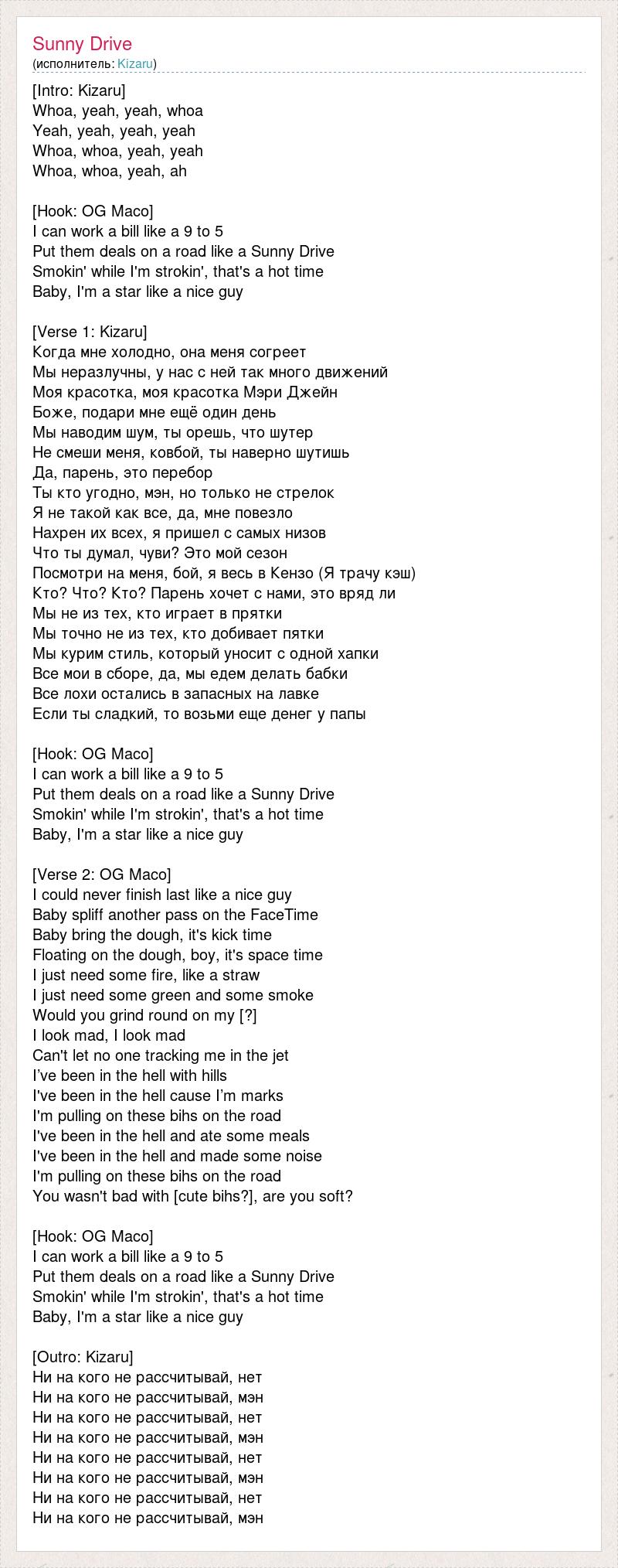 [Intro: Kizaru] Whoa, yeah, yeah, whoa Yeah, yeah, yeah, yeah Whoa, whoa, yeah, yeah Whoa, whoa, yeah, ah [Hook: OG Maco] I can work a bill like a 9 to 5 Put them deals on a road like a Sunny Drive Smokin' while I'm strokin', that's a hot time Baby, I'm a star like a nice guy [Verse 1: Kizaru] Когда мне холодно, она меня согреет Мы неразлучны, у нас с ней так много движений Моя красотка, моя красотка Мэри Джейн Боже, подари мне ещё один день Мы наводим шум, ты орешь, что шутер Не смеши меня, ковбой, ты наверно шутишь Да, парень, это перебор Ты кто угодно, мэн, но только не стрелок Я не такой как все, да, мне повезло Нахрен их всех, я пришел с самых низов Что ты думал, чуви? Это мой сезон Посмотри на меня, бой, я весь в Кензо (Я трачу кэш) Кто? Что? Кто? Парень хочет с нами, это вряд ли Мы не из тех, кто играет в прятки Мы точно не из тех, кто добивает пятки Мы курим стиль, который уносит с одной хапки Все мои в сборе, да, мы едем делать бабки Все лохи остались в запасных на лавке Если ты сладкий, то возьми еще денег у папы [Hook: OG Maco] I can work a bill like a 9 to 5 Put them deals on a road like a Sunny Drive Smokin' while I'm strokin', that's a hot time Baby, I'm a star like a nice guy [Verse 2: OG Maco] I could never finish last like a nice guy Baby spliff another pass on the FaceTime Baby bring the dough, it's kick time Floating on the dough, boy, it's space time I just need some fire, like a straw I just need some green and some smoke Would you grind round on my [?] I look mad, I look mad Can't let no one tracking me in the jet I’ve been in the hell with hills I've been in the hell cause I’m marks I'm pulling on these bihs on the road I've been in the hell and ate some meals I've been in the hell and made some noise I'm pulling on these bihs on the road You wasn't bad with [cute bihs?], are you soft? [Hook: OG Maco] I can work a bill like a 9 to 5 Put them deals on a road like a Sunny Drive Smokin' while I'm strokin', that's a hot time Baby, I'm a star like a nice guy [Outro: Kizaru] Ни на кого не рассчитывай, нет Ни на кого не рассчитывай, мэн Ни на кого не рассчитывай, нет Ни на кого не рассчитывай, мэн Ни на кого не рассчитывай, нет Ни на кого не рассчитывай, мэн Ни на кого не рассчитывай, нет Ни на кого не рассчитывай, мэн