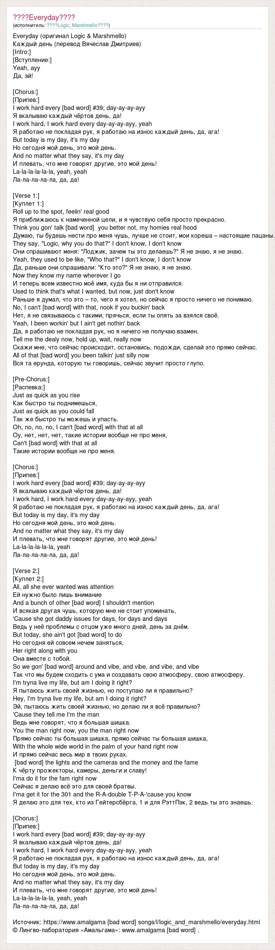 Everyday (оригинал Logic & Marshmello) Каждый день (перевод Вячеслав Дмитриев) [Intro:] [Вступление:] Yeah, ayy Да, эй! [Chorus:] [Припев:] I work hard every [bad word] #39; day-ay-ay-ayy Я вкалываю каждый чёртов день, да! I work hard, I work hard every day-ay-ay-ayy, yeah Я работаю не покладая рук, я работаю на износ каждый день, да, ага! But today is my day, it's my day Но сегодня мой день, это мой день. And no matter what they say, it's my day И плевать, что мне говорят другие, это мой день! La-la-la-la-la-la, yeah, yeah Ла-ла-ла-ла-ла, да, да! [Verse 1:] [Куплет 1:] Roll up to the spot, feelin' real good Я приближаюсь к намеченной цели, и я чувствую себя просто прекрасно. Think you gon' talk [bad word] you better not, my homies real hood Думаю, ты будешь нести про меня чушь, лучше не стоит, мои кореша – настоящие пацаны. They say, "Logic, why you do that?" I don't know, I don't know Они спрашивают меня: "Лоджик, зачем ты это делаешь?" Я не знаю, я не знаю. Yeah, they used to be like, "Who that?" I don't know, I don't know Да, раньше они спрашивали: "Кто это?" Я не знаю, я не знаю. Now they know my name wherever I go И теперь всем известно моё имя, куда бы я ни отправился. Used to think that's what I wanted, but now, just don't know Раньше я думал, что это – то, чего я хотел, но сейчас я просто ничего не понимаю. No, I can't [bad word] with that, nook if you buckin' back Нет, я не связываюсь с такими, прячься, если ты опять за взялся своё. Yeah, I been workin' but I ain't get nothin' back Да, я работаю не покладая рук, но я ничего не получаю взамен. Tell me the dealy now, hold up, wait, really now Скажи мне, что сейчас происходит, остановись, подожди, сделай это прямо сейчас. All of that [bad word] you been talkin' just silly now Вся та ерунда, которую ты говоришь, сейчас звучит просто глупо. [Pre-Chorus:] [Распевка:] Just as quick as you rise Как быстро ты поднимешься, Just as quick as you could fall Так же быстро ты можешь и упасть. Oh, no, no, no, I can't [bad word] with that at all Оу, нет, нет, нет, такие истории вообще не про меня, Can't [bad word] with that at all Такие истории вообще не про меня. [Chorus:] [Припев:] I work hard every [bad word] #39; day-ay-ay-ayy Я вкалываю каждый чёртов день, да! I work hard, I work hard every day-ay-ay-ayy, yeah Я работаю не покладая рук, я работаю на износ каждый день, да, ага! But today is my day, it's my day Но сегодня мой день, это мой день. And no matter what they say, it's my day И плевать, что мне говорят другие, это мой день! La-la-la-la-la-la, yeah Ла-ла-ла-ла-ла, да, да! [Verse 2:] [Куплет 2:] All, all she ever wanted was attention Ей нужно было лишь внимание And a bunch of other [bad word] I shouldn't mention И всякая другая чушь, которую мне не стоит упоминать, 'Cause she got daddy issues for days, for days and days Ведь у неё проблемы с отцом уже много дней, день за днём. But today, she ain't got [bad word] to do Но сегодня ей совсем нечем заняться, Her right along with you Она вместе с тобой. So we gon' [bad word] around and vibe, and vibe, and vibe, and vibe Так что мы будем сходить с ума и создавать свою атмосферу, свою атмосферу. I'm tryna live my life, but am I doing it right? Я пытаюсь жить своей жизнью, но поступаю ли я правильно? Hey, I'm tryna live my life, but am I doing it right? Эй, пытаюсь жить своей жизнью, но делаю ли я всё правильно? 'Cause they tell me I'm the man Ведь мне говорят, что я большая шишка. You the man right now, you the man right now Прямо сейчас ты большая шишка, прямо сейчас ты большая шишка, With the whole wide world in the palm of your hand right now И прямо сейчас весь мир в твоих руках. [bad word] the lights and the cameras and the money and the fame К чёрту прожекторы, камеры, деньги и славу! I'ma do it for the fam right now Сейчас я делаю всё это для своей братвы. I'ma get it for the 301 and the R-A-double T-P-A-'cause you know Я делаю это для тех, кто из Гейтерсбёрга, 1 и для РэттПэк, 2 ведь ты это знаешь. [Chorus:] [Припев:] I work hard every [bad word] #39; day-ay-ay-ayy Я вкалываю каждый чёртов день, да! I work hard, I work hard every day-ay-ay-ayy, yeah Я работаю не покладая рук, я работаю на износ каждый день, да, ага! But today is my day, it's my day Но сегодня мой день, это мой день. And no matter what they say, it's 