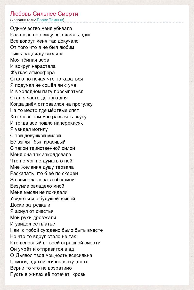 Одиночество меня убивала Казалось про виду всю жизнь один Все вокруг меня так докучало От того что я не был любим Лишь надежду вселяла Моя тёмная вера И вокруг нарастала Жуткая атмосфера Стало по ночам что то казаться Я подумал не сошёл ли с ума И в холодном пату просыпаться Стал я часто до того дня Когда днём отправился на прогулку На то место где мёртвые спят Хотелось там мне развеять скуку И тогда все пошло наперекасяк Я увидел могилу С той девушкой милой Её взглят был красивый С такой таинственной силой Меня она так заколдовала Что не мог не думать о ней Мне желания душу терзала Раскапать что б её по скорей За звинела лопата об камни Безумие овладело мной Меня мысли не покидали Увидеться с будущей жиной Доски затрещали Я ахнул от счастья Мои руки дрозжали И увидел её платье Нам с тобой суждено было быть вместе Но что то вдруг стало не так Кто веновный в твоей страшной смерти Он умрёт и отправится в ад О Дьявол твоя мощность всесильна Помоги, вдахни жизнь в эту плоть Верни то что не возратимо Пусть в жилах её потечет кровь