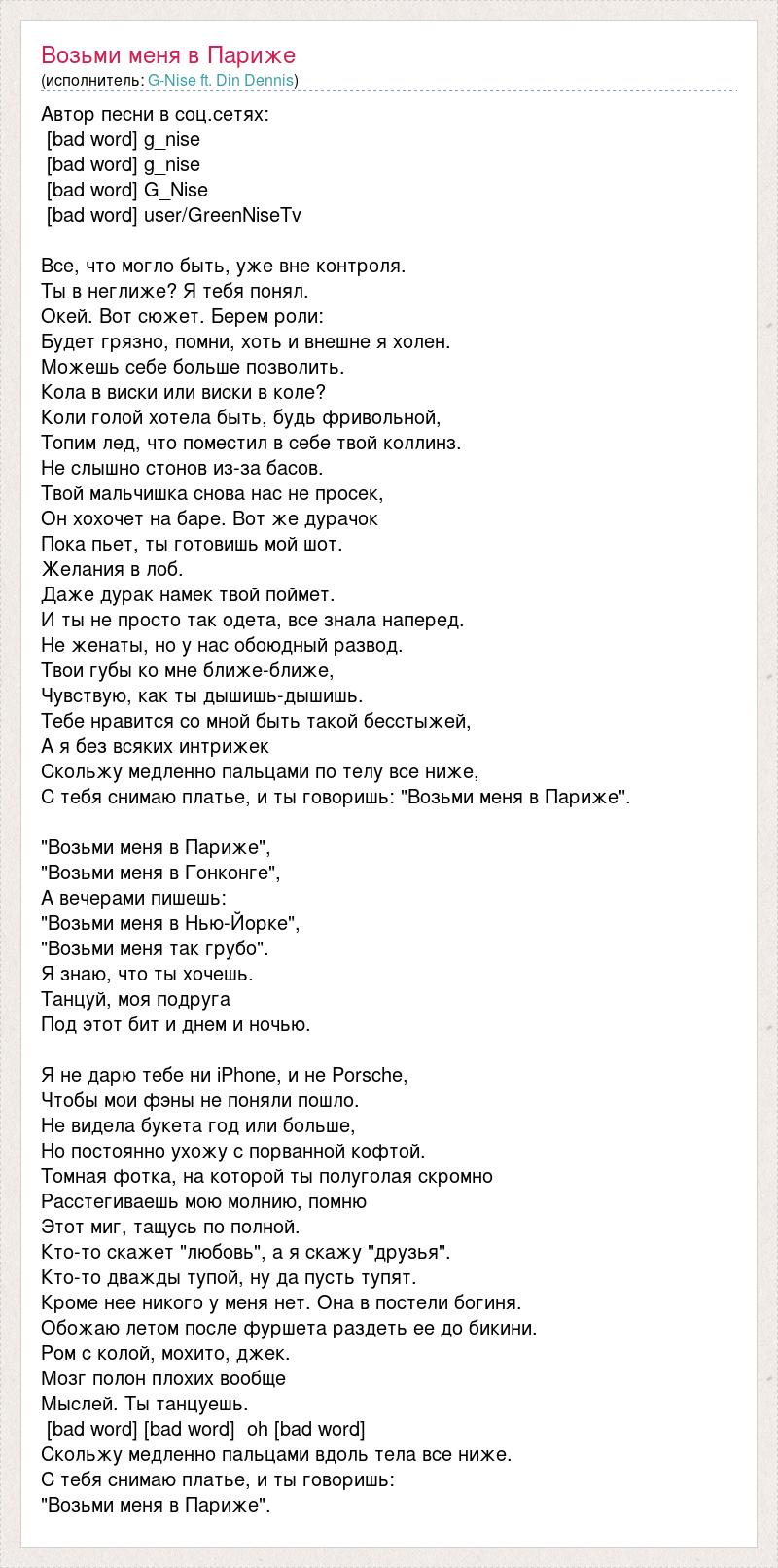 Автор песни в соц.сетях: [bad word] g_nise [bad word] g_nise [bad word] G_Nise [bad word] user/GreenNiseTv Все, что могло быть, уже вне контроля. Ты в неглиже? Я тебя понял. Окей. Вот сюжет. Берем роли: Будет грязно, помни, хоть и внешне я холен. Можешь себе больше позволить. Кола в виски или виски в коле? Коли голой хотела быть, будь фривольной, Топим лед, что поместил в себе твой коллинз. Не слышно стонов из-за басов. Твой мальчишка снова нас не просек, Он хохочет на баре. Вот же дурачок Пока пьет, ты готовишь мой шот. Желания в лоб. Даже дурак намек твой поймет. И ты не просто так одета, все знала наперед. Не женаты, но у нас обоюдный развод. Твои губы ко мне ближе-ближе, Чувствую, как ты дышишь-дышишь. Тебе нравится со мной быть такой бесстыжей, А я без всяких интрижек Скольжу медленно пальцами по телу все ниже, С тебя снимаю платье, и ты говоришь: "Возьми меня в Париже". "Возьми меня в Париже", "Возьми меня в Гонконге", А вечерами пишешь: "Возьми меня в Нью-Йорке", "Возьми меня так грубо". Я знаю, что ты хочешь. Танцуй, моя подруга Под этот бит и днем и ночью. Я не дарю тебе ни iPhone, и не Porsche, Чтобы мои фэны не поняли пошло. Не видела букета год или больше, Но постоянно ухожу с порванной кофтой. Томная фотка, на которой ты полуголая скромно Расстегиваешь мою молнию, помню Этот миг, тащусь по полной. Кто-то скажет "любовь", а я скажу "друзья". Кто-то дважды тупой, ну да пусть тупят. Кроме нее никого у меня нет. Она в постели богиня. Обожаю летом после фуршета раздеть ее до бикини. Ром с колой, мохито, джек. Мозг полон плохих вообще Мыслей. Ты танцуешь. [bad word] [bad word] oh [bad word] Скольжу медленно пальцами вдоль тела все ниже. С тебя снимаю платье, и ты говоришь: "Возьми меня в Париже".