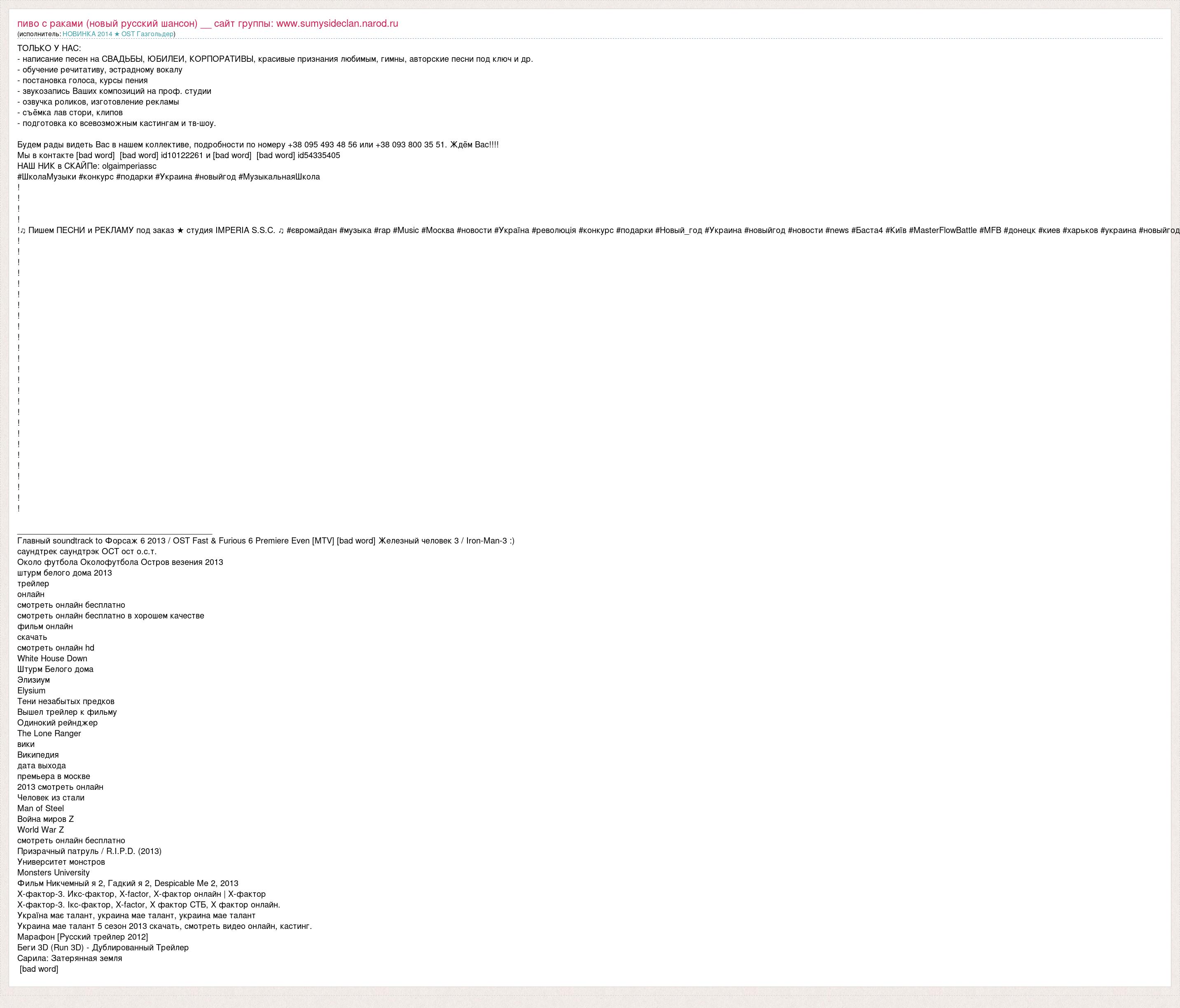 ТОЛЬКО У НАС: - написание песен на СВАДЬБЫ, ЮБИЛЕИ, КОРПОРАТИВЫ, красивые признания любимым, гимны, авторские песни под ключ и др. - обучение речитативу, эстрадному вокалу - постановка голоса, курсы пения - звукозапись Ваших композиций на проф. студии - озвучка роликов, изготовление рекламы - съёмка лав стори, клипов - подготовка ко всевозможным кастингам и тв-шоу. Будем рады видеть Вас в нашем коллективе, подробности по номеру +38 095 493 48 56 или +38 093 800 35 51. Ждём Вас!!!! Мы в контакте [bad word] [bad word] id10122261 и [bad word] [bad word] id54335405 НАШ НИК в СКАЙПе: olgaimperiassc #ШколаМузыки #конкурс #подарки #Украина #новыйгод #МузыкальнаяШкола ! ! ! ! !♫ Пишем ПЕСНИ и РЕКЛАМУ под заказ ★ студия IMPERIA S.S.C. ♫ #євромайдан #музыка #rap #Music #Москва #новости #Україна #революція #конкурс #подарки #Новый_год #Украина #новыйгод #новости #news #Баста4 #Київ #MasterFlowBattle #MFB #донецк #киев #харьков #украина #новыйгод ! ! ! ! ! ! ! ! ! ! ! ! ! ! ! ! ! ! ! ! ! ! ! ! ! ! ___________________________________________ Главный soundtrack to Форсаж 6 2013 / OST Fast & Furious 6 Premiere Even [MTV] [bad word] Железный человек 3 / Iron-Man-3 :) саундтрек саундтрэк ОСТ ост о.с.т. Около футбола Околофутбола Остров везения 2013 штурм белого дома 2013 трейлер онлайн смотреть онлайн бесплатно смотреть онлайн бесплатно в хорошем качестве фильм онлайн скачать смотреть онлайн hd White House Down Штурм Белого дома Элизиум Elysium Тени незабытых предков Вышел трейлер к фильму Одинокий рейнджер The Lone Ranger вики Википедия дата выхода премьера в москве 2013 смотреть онлайн Человек из стали Man of Steel Война миров Z World War Z смотреть онлайн бесплатно Призрачный патруль / R.I.P.D. (2013) Университет монстров Monsters University Фильм Никчемный я 2, Гадкий я 2, Despicable Me 2, 2013 Х-фактор-3. Икс-фактор, X-factor, Х-фактор онлайн | Х-фактор Х-фактор-3. Ікс-фактор, X-factor, Х фактор СТБ, Х фактор онлайн. Україна має талант, украина мае талант, украина мае талант Украина мае талант 5 сезон 2013 скачать, смотреть видео онлайн, кастинг. Марафон [Русский трейлер 2012] Беги 3D (Run 3D) - Дублированный Трейлер Сарила: Затерянная земля [bad word]
