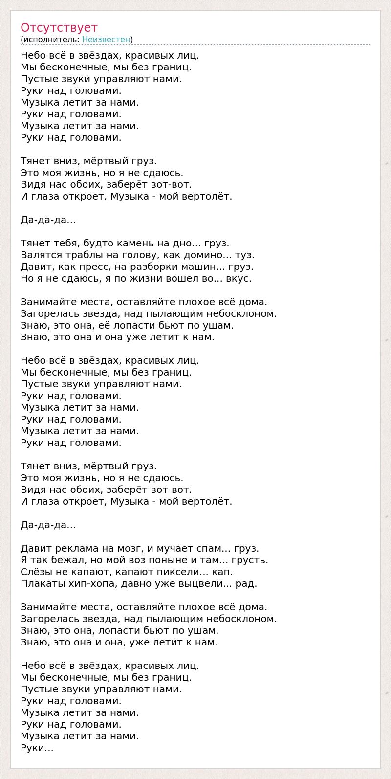 Небо всё в звёздах, красивых лиц. Мы бесконечные, мы без границ. Пустые звуки управляют нами. Руки над головами. Музыка летит за нами. Руки над головами. Музыка летит за нами. Руки над головами. Тянет вниз, мёртвый груз. Это моя жизнь, но я не сдаюсь. Видя нас обоих, заберёт вот-вот. И глаза откроет, Музыка - мой вертолёт. Да-да-да... Тянет тебя, будто камень на дно... груз. Валятся траблы на голову, как домино... туз. Давит, как пресс, на разборки машин... груз. Но я не сдаюсь, я по жизни вошел во... вкус. Занимайте места, оставляйте плохое всё дома. Загорелась звезда, над пылающим небосклоном. Знаю, это она, её лопасти бьют по ушам. Знаю, это она и она уже летит к нам. Небо всё в звёздах, красивых лиц. Мы бесконечные, мы без границ. Пустые звуки управляют нами. Руки над головами. Музыка летит за нами. Руки над головами. Музыка летит за нами. Руки над головами. Тянет вниз, мёртвый груз. Это моя жизнь, но я не сдаюсь. Видя нас обоих, заберёт вот-вот. И глаза откроет, Музыка - мой вертолёт. Да-да-да... Давит реклама на мозг, и мучает спам... груз. Я так бежал, но мой воз поныне и там... грусть. Слёзы не капают, капают пиксели... кап. Плакаты хип-хопа, давно уже выцвели... рад. Занимайте места, оставляйте плохое всё дома. Загорелась звезда, над пылающим небосклоном. Знаю, это она, лопасти бьют по ушам. Знаю, это она и она, уже летит к нам. Небо всё в звёздах, красивых лиц. Мы бесконечные, мы без границ. Пустые звуки управляют нами. Руки над головами. Музыка летит за нами. Руки над головами. Музыка летит за нами. Руки...
