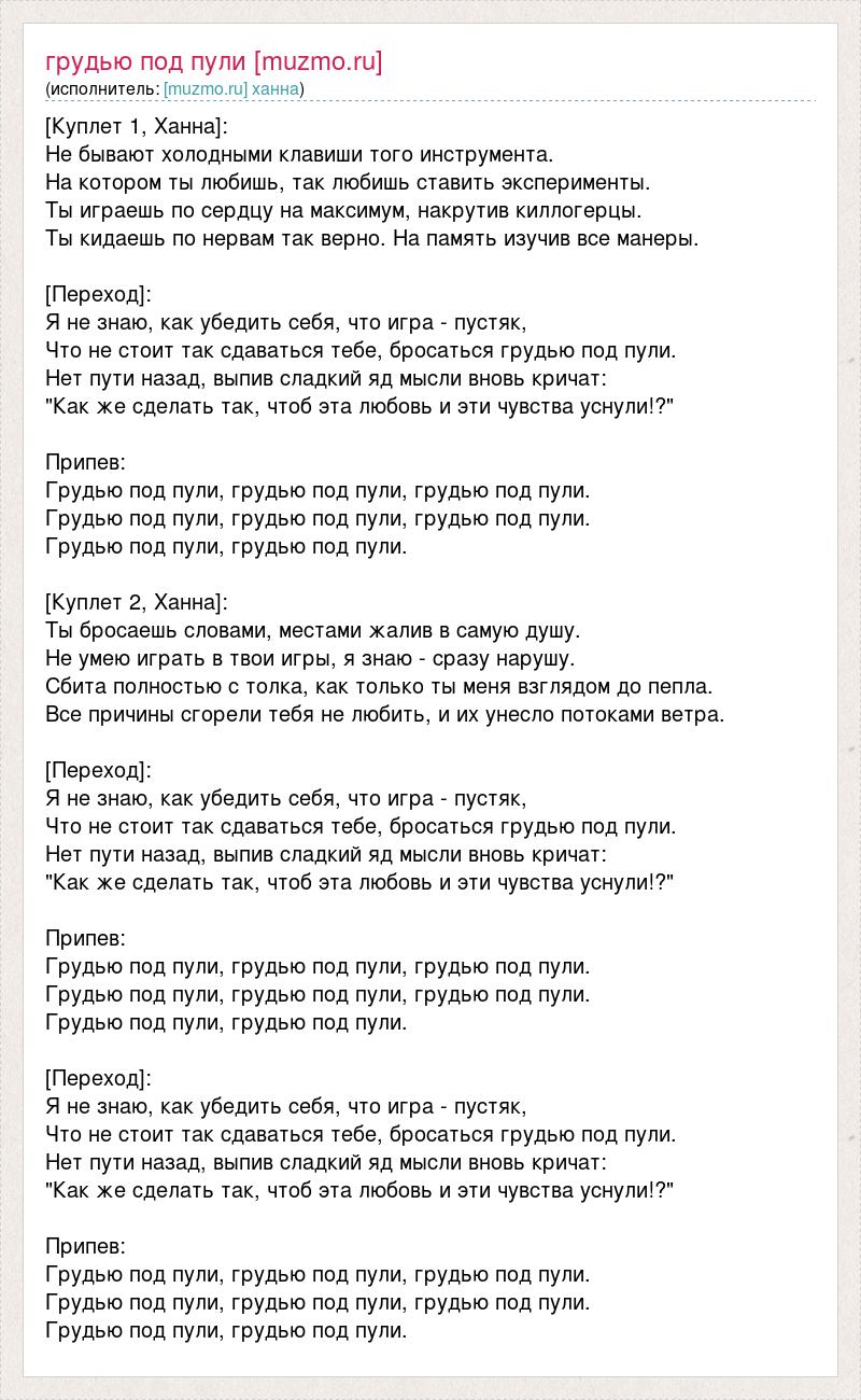 [Куплет 1, Ханна]: Не бывают холодными клавиши того инструмента. На котором ты любишь, так любишь ставить эксперименты. Ты играешь по сердцу на максимум, накрутив киллогерцы. Ты кидаешь по нервам так верно. На память изучив все манеры. [Переход]: Я не знаю, как убедить себя, что игра - пустяк, Что не стоит так сдаваться тебе, бросаться грудью под пули. Нет пути назад, выпив сладкий яд мысли вновь кричат: "Как же сделать так, чтоб эта любовь и эти чувства уснули!?" Припев: Грудью под пули, грудью под пули, грудью под пули. Грудью под пули, грудью под пули, грудью под пули. Грудью под пули, грудью под пули. [Куплет 2, Ханна]: Ты бросаешь словами, местами жалив в самую душу. Не умею играть в твои игры, я знаю - сразу нарушу. Сбита полностью с толка, как только ты меня взглядом до пепла. Все причины сгорели тебя не любить, и их унесло потоками ветра. [Переход]: Я не знаю, как убедить себя, что игра - пустяк, Что не стоит так сдаваться тебе, бросаться грудью под пули. Нет пути назад, выпив сладкий яд мысли вновь кричат: "Как же сделать так, чтоб эта любовь и эти чувства уснули!?" Припев: Грудью под пули, грудью под пули, грудью под пули. Грудью под пули, грудью под пули, грудью под пули. Грудью под пули, грудью под пули. [Переход]: Я не знаю, как убедить себя, что игра - пустяк, Что не стоит так сдаваться тебе, бросаться грудью под пули. Нет пути назад, выпив сладкий яд мысли вновь кричат: "Как же сделать так, чтоб эта любовь и эти чувства уснули!?" Припев: Грудью под пули, грудью под пули, грудью под пули. Грудью под пули, грудью под пули, грудью под пули. Грудью под пули, грудью под пули.