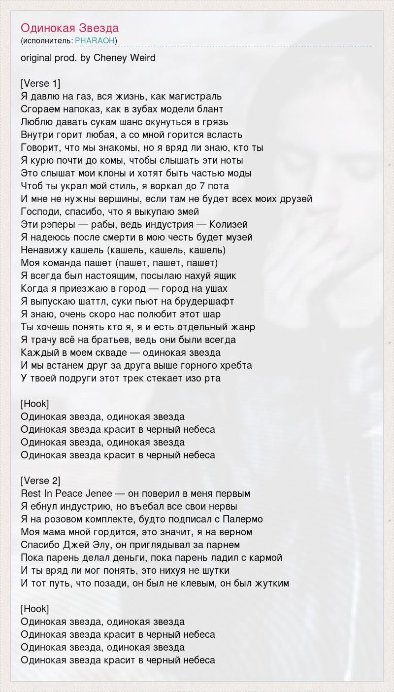 original prod. by Cheney Weird [Verse 1] Я давлю на газ, вся жизнь, как магистраль Сгораем напоказ, как в зубах модели блант Люблю давать сукам шанс окунуться в грязь Внутри горит любая, а со мной горится всласть Говорит, что мы знакомы, но я вряд ли знаю, кто ты Я курю почти до комы, чтобы слышать эти ноты Это слышат мои клоны и хотят быть частью моды Чтоб ты украл мой стиль, я воркал до 7 пота И мне не нужны вершины, если там не будет всех моих друзей Господи, спасибо, что я выкупаю змей Эти рэперы — рабы, ведь индустрия — Колизей Я надеюсь после смерти в мою честь будет музей Ненавижу кашель (кашель, кашель, кашель) Моя команда пашет (пашет, пашет, пашет) Я всегда был настоящим, посылаю нахуй ящик Когда я приезжаю в город — город на ушах Я выпускаю шаттл, суки пьют на брудершафт Я знаю, очень скоро нас полюбит этот шар Ты хочешь понять кто я, я и есть отдельный жанр Я трачу всё на братьев, ведь они были всегда Каждый в моем скваде — одинокая звезда И мы встанем друг за друга выше горного хребта У твоей подруги этот трек стекает изо рта [Hook] Одинокая звезда, одинокая звезда Одинокая звезда красит в черный небеса Одинокая звезда, одинокая звезда Одинокая звезда красит в черный небеса [Verse 2] Rest In Peace Jenee — он поверил в меня первым Я ебнул индустрию, но въебал все свои нервы Я на розовом комплекте, будто подписал с Палермо Моя мама мной гордится, это значит, я на верном Спасибо Джей Элу, он приглядывал за парнем Пока парень делал деньги, пока парень ладил с кармой И ты вряд ли мог понять, это нихуя не шутки И тот путь, что позади, он был не клевым, он был жутким [Hook] Одинокая звезда, одинокая звезда Одинокая звезда красит в черный небеса Одинокая звезда, одинокая звезда Одинокая звезда красит в черный небеса