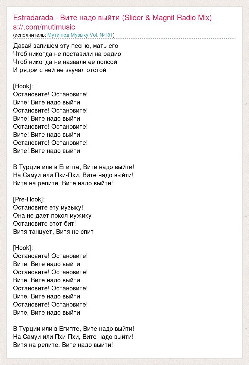 Давай запишем эту песню, мать его Чтоб никогда не поставили на радио Чтоб никогда не назвали ее попсой И рядом с ней не звучал отстой [Hook]: Остановите! Остановите! Вите! Вите надо выйти Остановите! Остановите! Вите! Вите надо выйти Остановите! Остановите! Вите! Вите надо выйти Остановите! Остановите! Вите! Вите надо выйти В Турции или в Египте, Вите надо выйти! На Самуи или Пхи-Пхи, Вите надо выйти! Витя на репите. Вите надо выйти! [Pre-Hook]: Остановите эту музыку! Она не дает покоя мужику Остановите этот бит! Витя танцует, Витя не спит [Hook]: Остановите! Остановите! Вите, Вите надо выйти Остановите! Остановите! Вите, Вите надо выйти Остановите! Остановите! Вите, Вите надо выйти Остановите! Остановите! Вите, Вите надо выйти В Турции или в Египте, Вите надо выйти! На Самуи или Пхи-Пхи, Вите надо выйти! Витя на репите. Вите надо выйти!