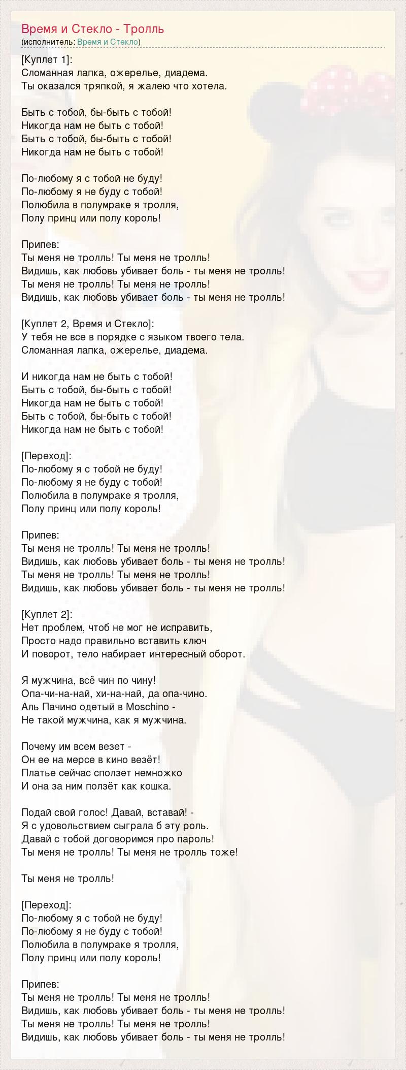 [Куплет 1]: Сломанная лапка, ожерелье, диадема. Ты оказался тряпкой, я жалею что хотела. Быть с тобой, бы-быть с тобой! Никогда нам не быть с тобой! Быть с тобой, бы-быть с тобой! Никогда нам не быть с тобой! По-любому я с тобой не буду! По-любому я не буду с тобой! Полюбила в полумраке я тролля, Полу принц или полу король! Припев: Ты меня не тролль! Ты меня не тролль! Видишь, как любовь убивает боль - ты меня не тролль! Ты меня не тролль! Ты меня не тролль! Видишь, как любовь убивает боль - ты меня не тролль! [Куплет 2, Время и Стекло]: У тебя не все в порядке с языком твоего тела. Сломанная лапка, ожерелье, диадема. И никогда нам не быть с тобой! Быть с тобой, бы-быть с тобой! Никогда нам не быть с тобой! Быть с тобой, бы-быть с тобой! Никогда нам не быть с тобой! [Переход]: По-любому я с тобой не буду! По-любому я не буду с тобой! Полюбила в полумраке я тролля, Полу принц или полу король! Припев: Ты меня не тролль! Ты меня не тролль! Видишь, как любовь убивает боль - ты меня не тролль! Ты меня не тролль! Ты меня не тролль! Видишь, как любовь убивает боль - ты меня не тролль! [Куплет 2]: Нет проблем, чтоб не мог не исправить, Просто надо правильно вставить ключ И поворот, тело набирает интересный оборот. Я мужчина, всё чин по чину! Опа-чи-на-най, xи-на-най, да опа-чино. Аль Пачино одетый в Moschino - Не такой мужчина, как я мужчина. Почему им всем везет - Он ее на мерсе в кино везёт! Платье сейчас сползет немножко И она за ним ползёт как кошка. Подай свой голос! Давай, вставай! - Я с удовольствием сыграла б эту роль. Давай с тобой договоримся про пароль! Ты меня не тролль! Ты меня не тролль тоже! Ты меня не тролль! [Переход]: По-любому я с тобой не буду! По-любому я не буду с тобой! Полюбила в полумраке я тролля, Полу принц или полу король! Припев: Ты меня не тролль! Ты меня не тролль! Видишь, как любовь убивает боль - ты меня не тролль! Ты меня не тролль! Ты меня не тролль! Видишь, как любовь убивает боль - ты меня не тролль!