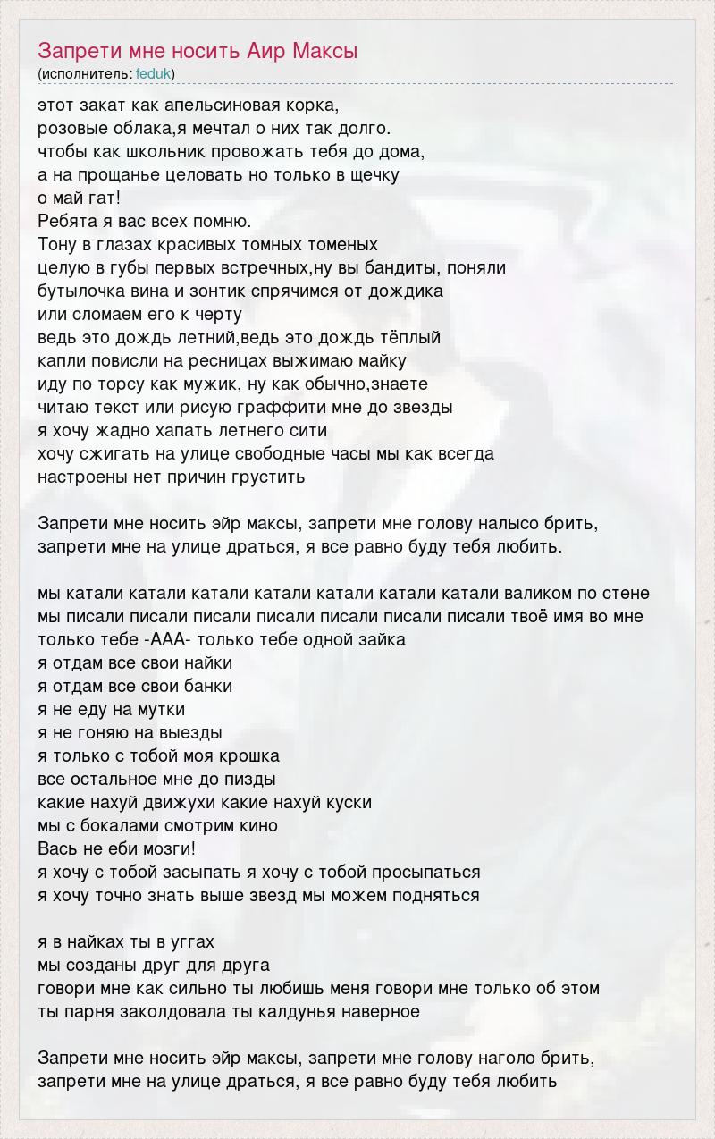 этот закат как апельсиновая корка, розовые облака,я мечтал о них так долго. чтобы как школьник провожать тебя до дома, а на прощанье целовать но только в щечку о май гат! Ребята я вас всех помню. Тону в глазах красивых томных томеных целую в губы первых встречных,ну вы бандиты, поняли бутылочка вина и зонтик спрячимся от дождика или сломаем его к черту ведь это дождь летний,ведь это дождь тёплый капли повисли на ресницах выжимаю майку иду по торсу как мужик, ну как обычно,знаете читаю текст или рисую граффити мне до звезды я хочу жадно хапать летнего сити хочу сжигать на улице свободные часы мы как всегда настроены нет причин грустить Запрети мне носить эйр максы, запрети мне голову налысо брить, запрети мне на улице драться, я все равно буду тебя любить. мы катали катали катали катали катали катали катали валиком по стене мы писали писали писали писали писали писали писали твоё имя во мне только тебе -ААА- только тебе одной зайка я отдам все свои найки я отдам все свои банки я не еду на мутки я не гоняю на выезды я только с тобой моя крошка все остальное мне до пизды какие нахуй движухи какие нахуй куски мы с бокалами смотрим кино Вась не еби мозги! я хочу с тобой засыпать я хочу с тобой просыпаться я хочу точно знать выше звезд мы можем подняться я в найках ты в уггах мы созданы друг для друга говори мне как сильно ты любишь меня говори мне только об этом ты парня заколдовала ты калдунья наверное Запрети мне носить эйр максы, запрети мне голову наголо брить, запрети мне на улице драться, я все равно буду тебя любить