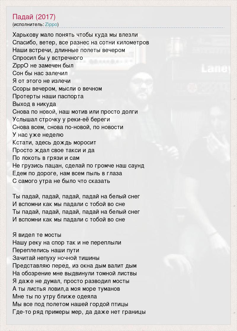Харькову мало понять чтобы куда мы влезли Спасибо, ветер, все разнес на сотни километров Наши встречи, длинные полеты вечером Спросил бы у встречного ZippO не замечен был Сон бы нас залечил Я от этого не излечи Ссоры вечером, мысли о вечном Протерты наши паспорта Выход в никуда Снова по новой, наш мотив или просто долги Услышал строчку у реки-её береги Снова всем, снова по-новой, по новости У нас уже неделю Кстати, здесь дождь моросит Просто ждал свое такси и да По локоть в грязи и сам Не грузись пацан, сделай по громче наш саунд Едем по дороге, нам всем пыль в глаза С самого утра не было что сказать Ты падай, падай, падай, падай на белый снег И вспомни как мы падали с тобой во сне Ты падай, падай, падай, падай на белый снег И вспомни как мы падали с тобой во сне Я видел те мосты Нашу реку на спор так и не переплыли Переплелись наши пути Зачитай непуху ночной тишины Представляю перед, из окна дым валит дым На обозрение мне выдвинули томной листвы Я даже не думал, просто разводил мосты А ты листья ловил,а моя море туманов Мне ты по утру ближе одеяла Мы все под полетом нашей гордой птицы Где-то ряд примеры мер, да даже нет границы