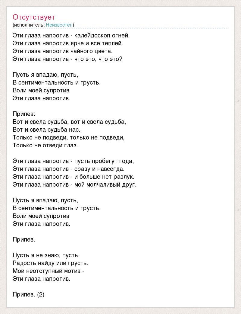 Эти глаза напротив - калейдоскоп огней. Эти глаза напротив ярче и все теплей. Эти глаза напротив чайного цвета. Эти глаза напротив - что это, что это? Пусть я впадаю, пусть, В сентиментальность и грусть. Воли моей супротив Эти глаза напротив. Припев: Вот и свела судьба, вот и свела судьба, Вот и свела судьба нас. Только не подведи, только не подведи, Только не отведи глаз. Эти глаза напротив - пусть пробегут года, Эти глаза напротив - сразу и навсегда. Эти глаза напротив - и больше нет разлук. Эти глаза напротив - мой молчаливый друг. Пусть я впадаю, пусть, В сентиментальность и грусть. Воли моей супротив Эти глаза напротив. Припев. Пусть я не знаю, пусть, Радость найду или грусть. Мой неотступный мотив - Эти глаза напротив. Припев. (2)
