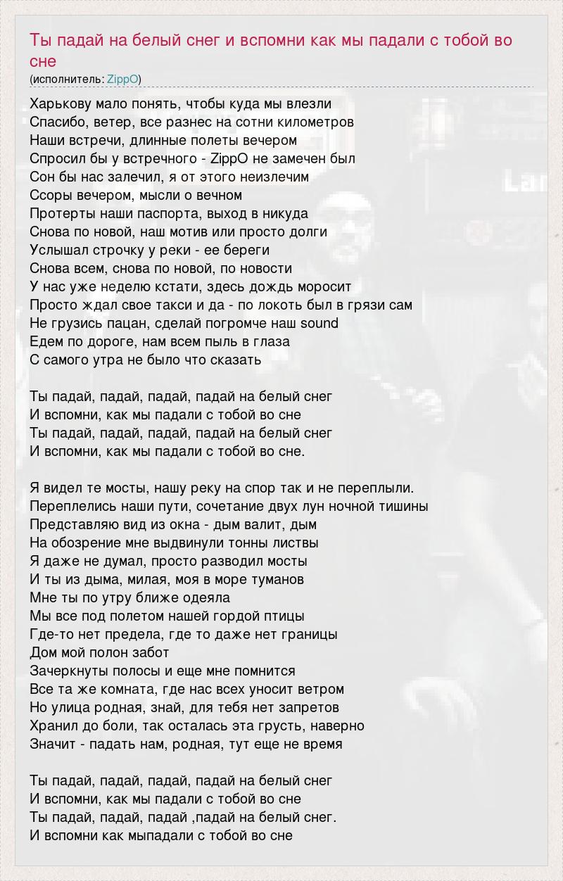 Харькову мало понять, чтобы куда мы влезли Спасибо, ветер, все разнес на сотни километров Наши встречи, длинные полеты вечером Спросил бы у встречного - ZippO не замечен был Сон бы нас залечил, я от этого неизлечим Ссоры вечером, мысли о вечном Протерты наши паспорта, выход в никуда Снова по новой, наш мотив или просто долги Услышал строчку у реки - ее береги Снова всем, снова по новой, по новости У нас уже неделю кстати, здесь дождь моросит Просто ждал свое такси и да - по локоть был в грязи сам Не грузись пацан, сделай погромче наш sound Едем по дороге, нам всем пыль в глаза С самого утра не было что сказать Ты падай, падай, падай, падай на белый снег И вспомни, как мы падали с тобой во сне Ты падай, падай, падай, падай на белый снег И вспомни, как мы падали с тобой во сне. Я видел те мосты, нашу реку на спор так и не переплыли. Переплелись наши пути, сочетание двух лун ночной тишины Представляю вид из окна - дым валит, дым На обозрение мне выдвинули тонны листвы Я даже не думал, просто разводил мосты И ты из дыма, милая, моя в море туманов Мне ты по утру ближе одеяла Мы все под полетом нашей гордой птицы Где-то нет предела, где то даже нет границы Дом мой полон забот Зачеркнуты полосы и еще мне помнится Все та же комната, где нас всех уносит ветром Но улица родная, знай, для тебя нет запретов Хранил до боли, так осталась эта грусть, наверно Значит - падать нам, родная, тут еще не время Ты падай, падай, падай, падай на белый снег И вспомни, как мы падали с тобой во сне Ты падай, падай, падай ,падай на белый снег. И вспомни как мыпадали с тобой во сне