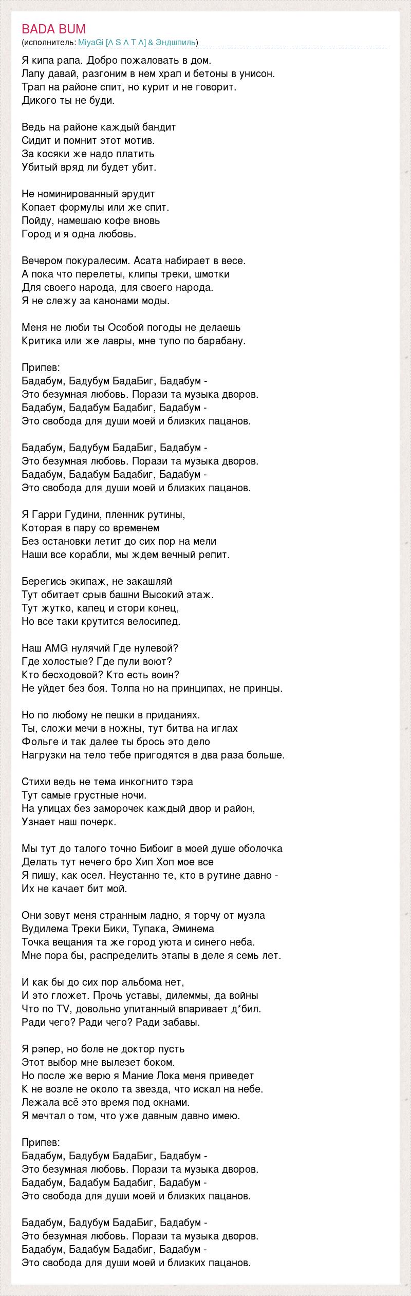 Я кипа рапа. Добро пожаловать в дом. Лапу давай, разгоним в нем храп и бетоны в унисон. Трап на районе спит, но курит и не говорит. Дикого ты не буди. Ведь на районе каждый бандит Сидит и помнит этот мотив. За косяки же надо платить Убитый вряд ли будет убит. Не номинированный эрудит Копает формулы или же спит. Пойду, намешаю кофе вновь Город и я одна любовь. Вечером покуралесим. Асата набирает в весе. А пока что перелеты, клипы треки, шмотки Для своего народа, для своего народа. Я не слежу за канонами моды. Меня не люби ты Особой погоды не делаешь Критика или же лавры, мне тупо по барабану. Припев: Бадабум, Бадубум БадаБиг, Бадабум - Это безумная любовь. Порази та музыка дворов. Бадабум, Бадабум Бадабиг, Бадабум - Это свобода для души моей и близких пацанов. Бадабум, Бадубум БадаБиг, Бадабум - Это безумная любовь. Порази та музыка дворов. Бадабум, Бадабум Бадабиг, Бадабум - Это свобода для души моей и близких пацанов. Я Гарри Гудини, пленник рутины, Которая в пару со временем Без остановки летит до сих пор на мели Наши все корабли, мы ждем вечный репит. Берегись экипаж, не закашляй Тут обитает срыв башни Высокий этаж. Тут жутко, капец и стори конец, Но все таки крутится велосипед. Наш AMG нулячий Где нулевой? Где холостые? Где пули воют? Кто бесходовой? Кто есть воин? Не уйдет без боя. Толпа но на принципах, не принцы. Но по любому не пешки в приданиях. Ты, сложи мечи в ножны, тут битва на иглах Фольге и так далее ты брось это дело Нагрузки на тело тебе пригодятся в два раза больше. Стихи ведь не тема инкогнито тэра Тут самые грустные ночи. На улицах без заморочек каждый двор и район, Узнает наш почерк. Мы тут до талого точно Бибоиг в моей душе оболочка Делать тут нечего бро Хип Хоп мое все Я пишу, как осел. Неустанно те, кто в рутине давно - Их не качает бит мой. Они зовут меня странным ладно, я торчу от музла Вудилема Треки Бики, Тупака, Эминема Точка вещания та же город уюта и синего неба. Мне пора бы, распределить этапы в деле я семь лет. И как бы до сих пор альбома нет, И это гложет. Прочь уставы, дилеммы, да войны Что по TV, довольно упитанный впаривает д*бил. Ради чего? Ради чего? Ради забавы. Я рэпер, но боле не доктор пусть Этот выбор мне вылезет боком. Но после же верю я Мание Лока меня приведет К не возле не около та звезда, что искал на небе. Лежала всё это время под окнами. Я мечтал о том, что уже давным давно имею. Припев: Бадабум, Бадубум БадаБиг, Бадабум - Это безумная любовь. Порази та музыка дворов. Бадабум, Бадабум Бадабиг, Бадабум - Это свобода для души моей и близких пацанов. Бадабум, Бадубум БадаБиг, Бадабум - Это безумная любовь. Порази та музыка дворов. Бадабум, Бадабум Бадабиг, Бадабум - Это свобода для души моей и близких пацанов.