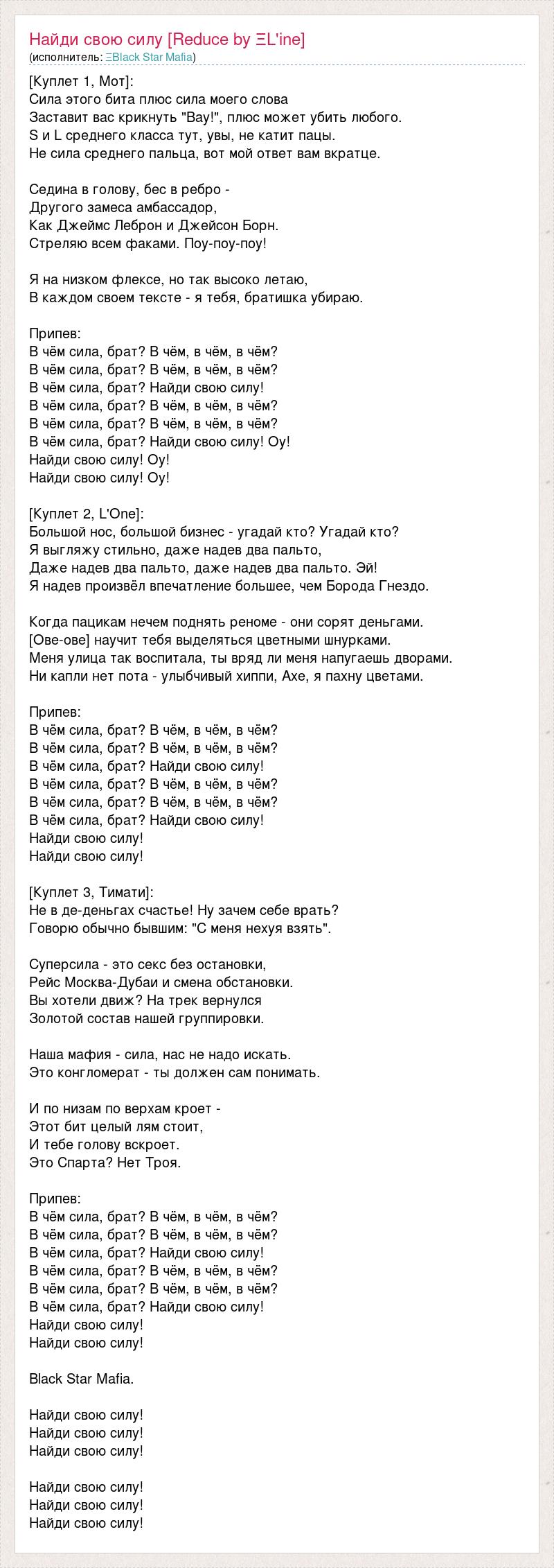 [Куплет 1, Мот]: Сила этого бита плюс сила моего слова Заставит вас крикнуть "Вау!", плюс может убить любого. S и L среднего класса тут, увы, не катит пацы. Не сила среднего пальца, вот мой ответ вам вкратце. Седина в голову, бес в ребро - Другого замеса амбассадор, Как Джеймс Леброн и Джейсон Борн. Стреляю всем факами. Поу-поу-поу! Я на низком флексе, но так высоко летаю, В каждом своем тексте - я тебя, братишка убираю. Припев: В чём сила, брат? В чём, в чём, в чём? В чём сила, брат? В чём, в чём, в чём? В чём сила, брат? Найди свою силу! В чём сила, брат? В чём, в чём, в чём? В чём сила, брат? В чём, в чём, в чём? В чём сила, брат? Найди свою силу! Оу! Найди свою силу! Оу! Найди свою силу! Оу! [Куплет 2, L'One]: Большой нос, большой бизнес - угадай кто? Угадай кто? Я выгляжу стильно, даже надев два пальто, Даже надев два пальто, даже надев два пальто. Эй! Я надев произвёл впечатление большее, чем Борода Гнездо. Когда пацикам нечем поднять реноме - они сорят деньгами. [Ове-ове] научит тебя выделяться цветными шнурками. Меня улица так воспитала, ты вряд ли меня напугаешь дворами. Ни капли нет пота - улыбчивый хиппи, Axe, я пахну цветами. Припев: В чём сила, брат? В чём, в чём, в чём? В чём сила, брат? В чём, в чём, в чём? В чём сила, брат? Найди свою силу! В чём сила, брат? В чём, в чём, в чём? В чём сила, брат? В чём, в чём, в чём? В чём сила, брат? Найди свою силу! Найди свою силу! Найди свою силу! [Куплет 3, Тимати]: Не в де-деньгах счастье! Ну зачем себе врать? Говорю обычно бывшим: "С меня нехуя взять". Суперсила - это секс без остановки, Рейс Москва-Дубаи и смена обстановки. Вы хотели движ? На трек вернулся Золотой состав нашей группировки. Наша мафия - сила, нас не надо искать. Это конгломерат - ты должен сам понимать. И по низам по верхам кроет - Этот бит целый лям стоит, И тебе голову вскроет. Это Спарта? Нет Троя. Припев: В чём сила, брат? В чём, в чём, в чём? В чём сила, брат? В чём, в чём, в чём? В чём сила, брат? Найди свою силу! В чём сила, брат? В чём, в чём, в чём? В чём сила, брат? В чём, в чём, в чём? В чём сила, брат? Найди свою силу! Найди свою силу! Найди свою силу! Black Star Mafia. Найди свою силу! Найди свою силу! Найди свою силу! Найди свою силу! Найди свою силу! Найди свою силу!