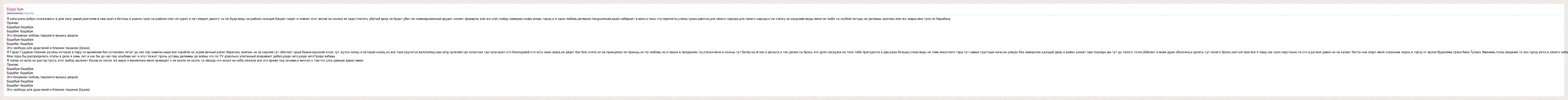 Я кипа рапа добро пожаловать в дом лапу давай разгоним в нем храп и бетоны в унисон трап на районе спит,но курит и не говорит,дикого ты не буди,ведь на районе каждый бандит сидит и помнит этот мотив за косяки эе надо платить убитый вряд ли будет убит не номинированный эрудит копает формулы или же спит,пойду намешаю кофе вновь город и я одна любовь,вечером покуралесим,asata набирает в весе,а пока что,перелеты,клипы,трэки,шмотки,для своего народа,для своего народа,я не слежу за канунами моды меня не люби ты особой погоды не делаешь критика или же лавры,мне тупо по барабану Припев: Бадабум бадабум Бадабиг бадабум Это безумная любовь паразита музыка дворов Бадабум бадабум Бадабиг бадабум Это свобода для души моей и близких пацанов (2раза) Я Гарик Гуддини пленник рутины которая в пару со временем без остановки летит до сих пор намели,наши все корабли но ждем вечный рэпит,берегись экипаж не за кашляй,тут обитают срыв башни высокий этаж,тут жутко капец и истории конец,но все таки крутится велосипед,наш amg нулячий,где холостые где пули воют,кто безходовой кто есть воин asata,не уйдет без боя,толпа но на принципах не принцы,но по-любому не в пешки в преданиях ты,сложи мечи в ножны тут битва на иглах в фольге и так далее,ты брось это дело нагрузки на тело тебе пригодятся в два раза больше,стихи ведь не тема инкогнито тэра тут самые грустные ночи,на улицах без заморочек,каждый двор и район узнает наш подчерк,мы тут до талого точно,бибоинг в моей душе оболочка,и делать тут нечего брооо,хип-хоп мое все я пишу как осел неустанно,те кто в рутине давно их не качает битло они зовут меня странным ладно,я торчу от музла Вудилема,трэки бики Тупака Эминема,точка вещания та же,город уюта и синего неба Мне пора бы,распределить этапы в деле я семь лет и как бы до сих пор альбома нет и это гложет прочь уставы,дилеммы да войны что по TV довольно упитанный впаривает дибил,ради чего,ради чего?ради забавы Я пэпер но воли не доктор пусть этот выбор вылезет боком,но после же верю я маниелока меня приведет к не возле не около та звезда что искал на небе,лежала все это время под окнами,я мечтал о том что уже давным давно имею Припев: Бадабум бадабум Бадабиг бадабум Это безумная любовь паразита музыка дворов Бадабум бадабум Бадабиг бадабум Это свобода для души моей и близких пацанов 2(раза)