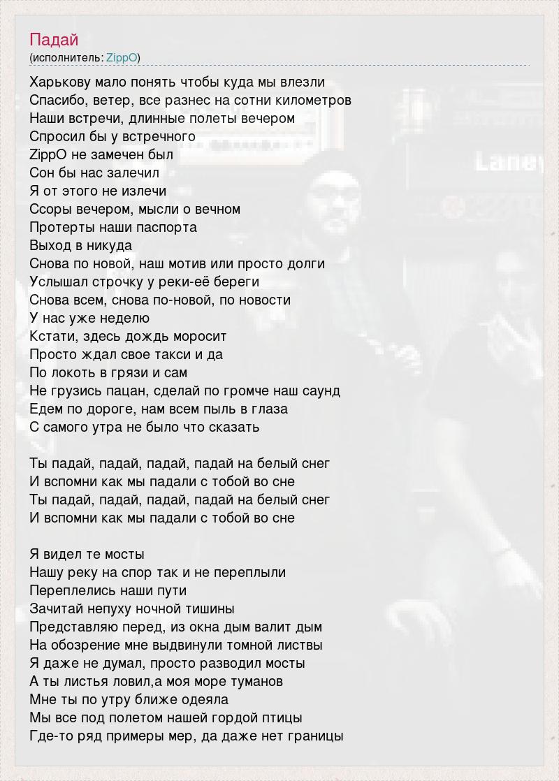 Харькову мало понять чтобы куда мы влезли Спасибо, ветер, все разнес на сотни километров Наши встречи, длинные полеты вечером Спросил бы у встречного ZippO не замечен был Сон бы нас залечил Я от этого не излечи Ссоры вечером, мысли о вечном Протерты наши паспорта Выход в никуда Снова по новой, наш мотив или просто долги Услышал строчку у реки-её береги Снова всем, снова по-новой, по новости У нас уже неделю Кстати, здесь дождь моросит Просто ждал свое такси и да По локоть в грязи и сам Не грузись пацан, сделай по громче наш саунд Едем по дороге, нам всем пыль в глаза С самого утра не было что сказать Ты падай, падай, падай, падай на белый снег И вспомни как мы падали с тобой во сне Ты падай, падай, падай, падай на белый снег И вспомни как мы падали с тобой во сне Я видел те мосты Нашу реку на спор так и не переплыли Переплелись наши пути Зачитай непуху ночной тишины Представляю перед, из окна дым валит дым На обозрение мне выдвинули томной листвы Я даже не думал, просто разводил мосты А ты листья ловил,а моя море туманов Мне ты по утру ближе одеяла Мы все под полетом нашей гордой птицы Где-то ряд примеры мер, да даже нет границы