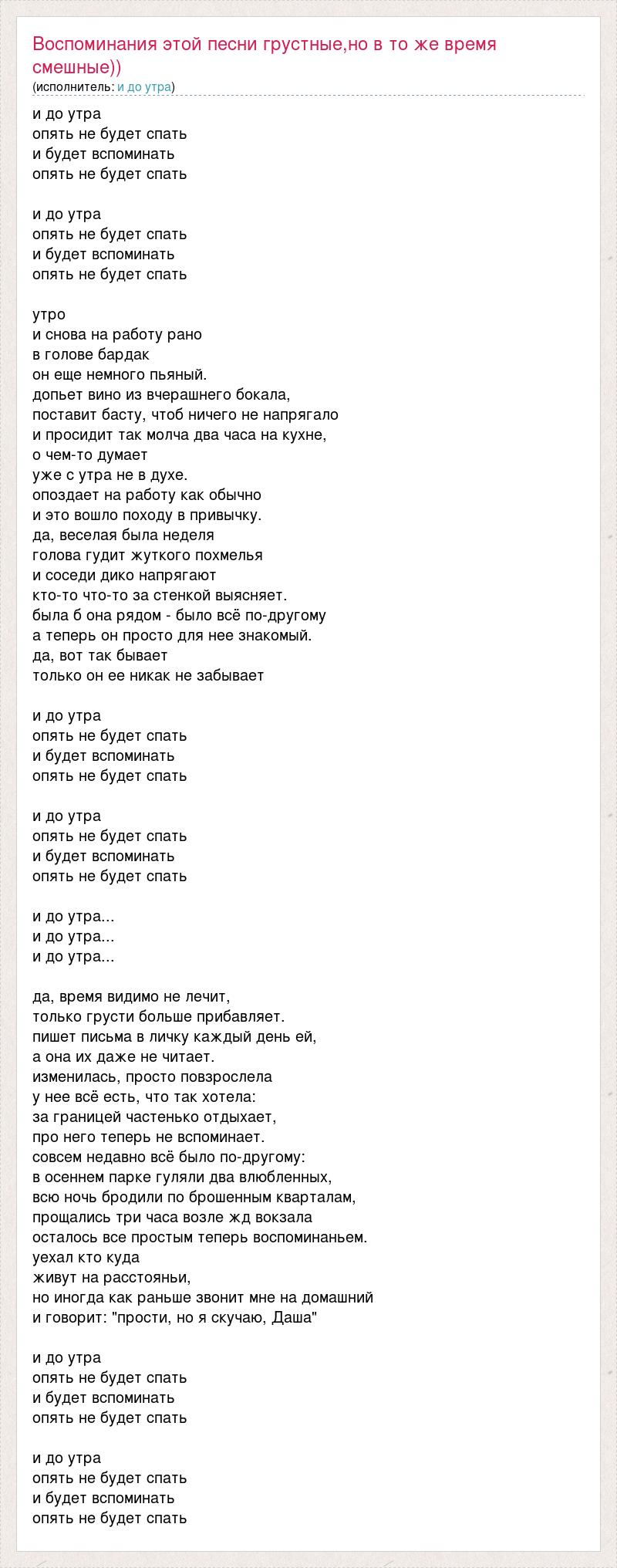 и до утра опять не будет спать и будет вспоминать опять не будет спать и до утра опять не будет спать и будет вспоминать опять не будет спать утро и снова на работу рано в голове бардак он еще немного пьяный. допьет вино из вчерашнего бокала, поставит басту, чтоб ничего не напрягало и просидит так молча два часа на кухне, о чем-то думает уже с утра не в духе. опоздает на работу как обычно и это вошло походу в привычку. да, веселая была неделя голова гудит жуткого похмелья и соседи дико напрягают кто-то что-то за стенкой выясняет. была б она рядом - было всё по-другому а теперь он просто для нее знакомый. да, вот так бывает только он ее никак не забывает и до утра опять не будет спать и будет вспоминать опять не будет спать и до утра опять не будет спать и будет вспоминать опять не будет спать и до утра... и до утра... и до утра... да, время видимо не лечит, только грусти больше прибавляет. пишет письма в личку каждый день ей, а она их даже не читает. изменилась, просто повзрослела у нее всё есть, что так хотела: за границей частенько отдыхает, про него теперь не вспоминает. совсем недавно всё было по-другому: в осеннем парке гуляли два влюбленных, всю ночь бродили по брошенным кварталам, прощались три часа возле жд вокзала осталось все простым теперь воспоминаньем. уехал кто куда живут на расстояньи, но иногда как раньше звонит мне на домашний и говорит: "прости, но я скучаю, Даша" и до утра опять не будет спать и будет вспоминать опять не будет спать и до утра опять не будет спать и будет вспоминать опять не будет спать
