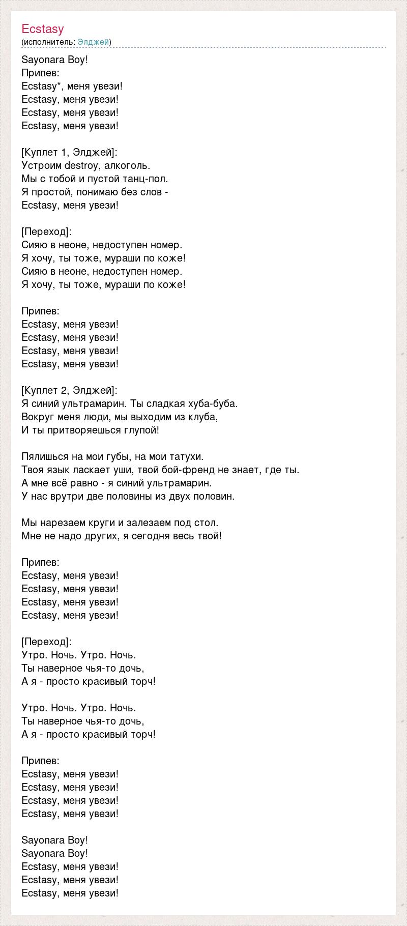 Sayonara Boy! Припев: Ecstasy*, меня увези! Ecstasy, меня увези! Ecstasy, меня увези! Ecstasy, меня увези! [Куплет 1, Элджей]: Устроим destroy, алкоголь. Мы с тобой и пустой танц-пол. Я простой, понимаю без слов - Ecstasy, меня увези! [Переход]: Сияю в неоне, недоступен номер. Я хочу, ты тоже, мураши по коже! Сияю в неоне, недоступен номер. Я хочу, ты тоже, мураши по коже! Припев: Ecstasy, меня увези! Ecstasy, меня увези! Ecstasy, меня увези! Ecstasy, меня увези! [Куплет 2, Элджей]: Я синий ультрамарин. Ты сладкая хуба-буба. Вокруг меня люди, мы выходим из клуба, И ты притворяешься глупой! Пялишься на мои губы, на мои татухи. Твоя язык ласкает уши, твой бой-френд не знает, где ты. А мне всё равно - я синий ультрамарин. У нас врутри две половины из двух половин. Мы нарезаем круги и залезаем под стол. Мне не надо других, я сегодня весь твой! Припев: Ecstasy, меня увези! Ecstasy, меня увези! Ecstasy, меня увези! Ecstasy, меня увези! [Переход]: Утро. Ночь. Утро. Ночь. Ты наверное чья-то дочь, А я - просто красивый торч! Утро. Ночь. Утро. Ночь. Ты наверное чья-то дочь, А я - просто красивый торч! Припев: Ecstasy, меня увези! Ecstasy, меня увези! Ecstasy, меня увези! Ecstasy, меня увези! Sayonara Boy! Sayonara Boy! Ecstasy, меня увези! Ecstasy, меня увези! Ecstasy, меня увези!