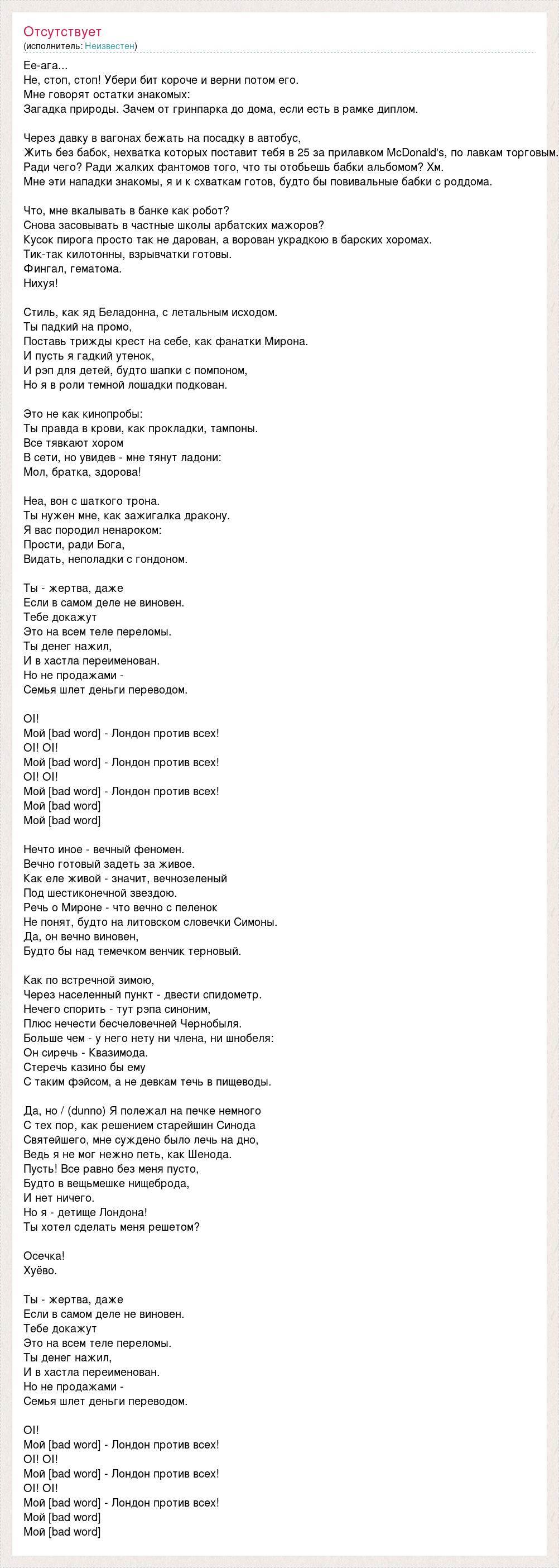 Ее-ага... Не, стоп, стоп! Убери бит короче и верни потом его. Мне говорят остатки знакомых: Загадка природы. Зачем от гринпарка до дома, если есть в рамке диплом. Через давку в вагонах бежать на посадку в автобус, Жить без бабок, нехватка которых поставит тебя в 25 за прилавком McDonald's, по лавкам торговым. Ради чего? Ради жалких фантомов того, что ты отобьешь бабки альбомом? Хм. Мне эти нападки знакомы, я и к схваткам готов, будто бы повивальные бабки с роддома. Что, мне вкалывать в банке как робот? Снова засовывать в частные школы арбатских мажоров? Кусок пирога просто так не дарован, а ворован украдкою в барских хоромах. Тик-так килотонны, взрывчатки готовы. Фингал, гематома. Нихуя! Стиль, как яд Беладонна, с летальным исходом. Ты падкий на промо, Поставь трижды крест на себе, как фанатки Мирона. И пусть я гадкий утенок, И рэп для детей, будто шапки с помпоном, Но я в роли темной лошадки подкован. Это не как кинопробы: Ты правда в крови, как прокладки, тампоны. Все тявкают хором В сети, но увидев - мне тянут ладони: Мол, братка, здорова! Неа, вон с шаткого трона. Ты нужен мне, как зажигалка дракону. Я вас породил ненароком: Прости, ради Бога, Видать, неполадки с гондоном. Ты - жертва, даже Если в самом деле не виновен. Тебе докажут Это на всем теле переломы. Ты денег нажил, И в хастла переименован. Но не продажами - Семья шлет деньги переводом. OI! Мой [bad word] - Лондон против всех! OI! OI! Мой [bad word] - Лондон против всех! OI! OI! Мой [bad word] - Лондон против всех! Мой [bad word] Мой [bad word] Нечто иное - вечный феномен. Вечно готовый задеть за живое. Как еле живой - значит, вечнозеленый Под шестиконечной звездою. Речь о Мироне - что вечно с пеленок Не понят, будто на литовском словечки Симоны. Да, он вечно виновен, Будто бы над темечком венчик терновый. Как по встречной зимою, Через населенный пункт - двести спидометр. Нечего спорить - тут рэпа синоним, Плюс нечести бесчеловечней Чернобыля. Больше чем - у него нету ни члена, ни шнобеля: Он сиречь - Квазимода. Стеречь казино бы ему С таким фэйсом, а не девкам течь в пищеводы. Да, но / (dunno) Я полежал на печке немного С тех пор, как решением старейшин Синода Святейшего, мне суждено было лечь на дно, Ведь я не мог нежно петь, как Шенода. Пусть! Все равно без меня пусто, Будто в вещьмешке нищеброда, И нет ничего. Но я - детище Лондона! Ты хотел сделать меня решетом? Осечка! Хуёво. Ты - жертва, даже Если в самом деле не виновен. Тебе докажут Это на всем теле переломы. Ты денег нажил, И в хастла переименован. Но не продажами - Семья шлет деньги переводом. OI! Мой [bad word] - Лондон против всех! OI! OI! Мой [bad word] - Лондон против всех! OI! OI! Мой [bad word] - Лондон против всех! Мой [bad word] Мой [bad word]