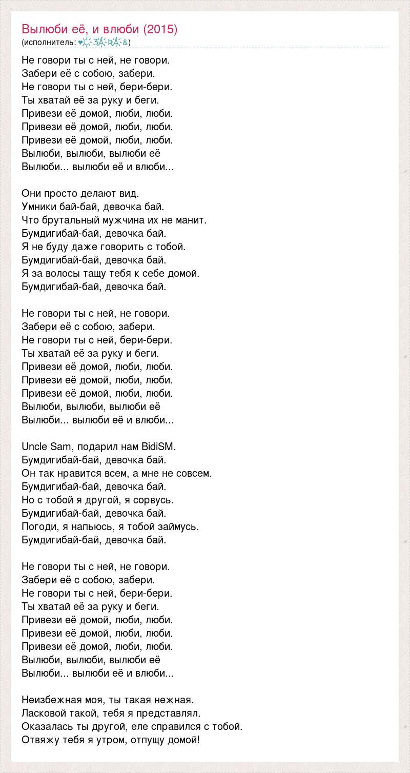 Не говори ты с ней, не говори. Забери её с собою, забери. Не говори ты с ней, бери-бери. Ты хватай её за руку и беги. Привези её домой, люби, люби. Привези её домой, люби, люби. Привези её домой, люби, люби. Вылюби, вылюби, вылюби её Вылюби... вылюби её и влюби... Они просто делают вид. Умники бай-бай, девочка бай. Что брутальный мужчина их не манит. Бумдигибай-бай, девочка бай. Я не буду даже говорить с тобой. Бумдигибай-бай, девочка бай. Я за волосы тащу тебя к себе домой. Бумдигибай-бай, девочка бай. Не говори ты с ней, не говори. Забери её с собою, забери. Не говори ты с ней, бери-бери. Ты хватай её за руку и беги. Привези её домой, люби, люби. Привези её домой, люби, люби. Привези её домой, люби, люби. Вылюби, вылюби, вылюби её Вылюби... вылюби её и влюби... Uncle Sam, подарил нам BidiSM. Бумдигибай-бай, девочка бай. Он так нравится всем, а мне не совсем. Бумдигибай-бай, девочка бай. Но с тобой я другой, я сорвусь. Бумдигибай-бай, девочка бай. Погоди, я напьюсь, я тобой займусь. Бумдигибай-бай, девочка бай. Не говори ты с ней, не говори. Забери её с собою, забери. Не говори ты с ней, бери-бери. Ты хватай её за руку и беги. Привези её домой, люби, люби. Привези её домой, люби, люби. Привези её домой, люби, люби. Вылюби, вылюби, вылюби её Вылюби... вылюби её и влюби... Неизбежная моя, ты такая нежная. Ласковой такой, тебя я представлял. Оказалась ты другой, еле справился с тобой. Отвяжу тебя я утром, отпущу домой!