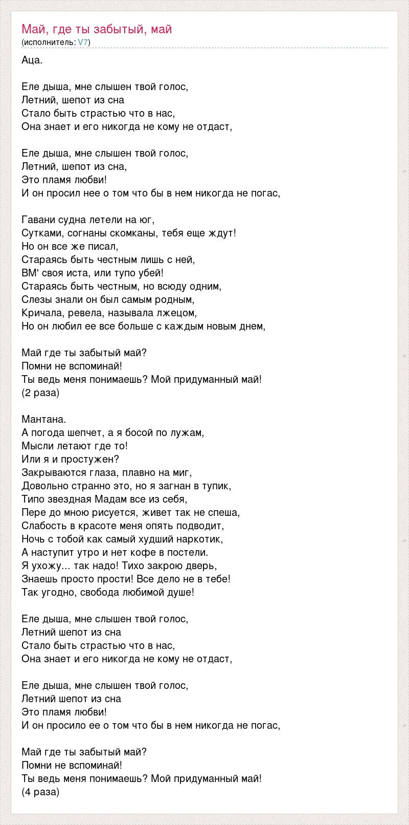 Аца. Еле дыша, мне слышен твой голос, Летний, шепот из сна Стало быть страстью что в нас, Она знает и его никогда не кому не отдаст, Еле дыша, мне слышен твой голос, Летний, шепот из сна, Это пламя любви! И он просил нее о том что бы в нем никогда не погас, Гавани судна летели на юг, Сутками, согнаны скомканы, тебя еще ждут! Но он все же писал, Стараясь быть честным лишь с ней, BM' своя иста, или тупо убей! Стараясь быть честным, но всюду одним, Слезы знали он был самым родным, Кричала, ревела, называла лжецом, Но он любил ее все больше с каждым новым днем, Май где ты забытый май? Помни не вспоминай! Ты ведь меня понимаешь? Мой придуманный май! (2 раза) Мантана. А погода шепчет, а я босой по лужам, Мысли летают где то! Или я и простужен? Закрываются глаза, плавно на миг, Довольно странно это, но я загнан в тупик, Типо звездная Мадам все из себя, Пере до мною рисуется, живет так не спеша, Слабость в красоте меня опять подводит, Ночь с тобой как самый худший наркотик, А наступит утро и нет кофе в постели. Я ухожу... так надо! Тихо закрою дверь, Знаешь просто прости! Все дело не в тебе! Так угодно, свобода любимой душе! Еле дыша, мне слышен твой голос, Летний шепот из сна Стало быть страстью что в нас, Она знает и его никогда не кому не отдаст, Еле дыша, мне слышен твой голос, Летний шепот из сна Это пламя любви! И он просило ее о том что бы в нем никогда не погас, Май где ты забытый май? Помни не вспоминай! Ты ведь меня понимаешь? Мой придуманный май! (4 раза)