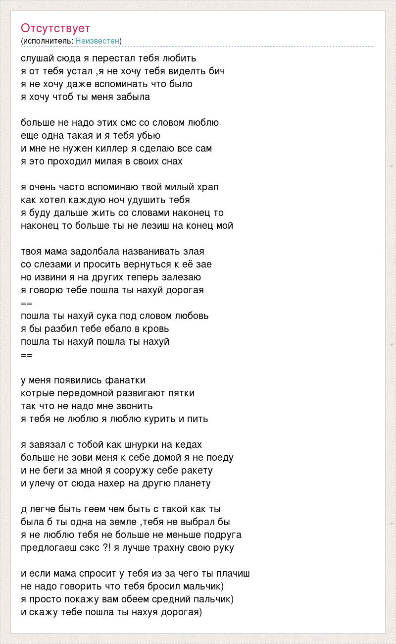 cлушай сюда я перестал тебя любить я от тебя устал ,я не хочу тебя виделть бич я не хочу даже вспоминать что было я хочу чтоб ты меня забыла больше не надо этих смс со словом люблю еще одна такая и я тебя убью и мне не нужен киллер я сделаю все сам я это проходил милая в своих снах я очень часто вспоминаю твой милый храп как хотел каждую ноч удушить тебя я буду дальше жить со словами наконец то наконец то больше ты не лезиш на конец мой твоя мама задолбала названивать злая со слезами и просить вернуться к её зае но извини я на других теперь залезаю я говорю тебе пошла ты нахуй дорогая == пошла ты нахуй сука под словом любовь я бы разбил тебе ебало в кровь пошла ты нахуй пошла ты нахуй == у меня появились фанатки котрые передомной развигают пятки так что не надо мне звонить я тебя не люблю я люблю курить и пить я завязал с тобой как шнурки на кедах больше не зови меня к себе домой я не поеду и не беги за мной я сооружу себе ракету и улечу от сюда нахер на другю планету д легче быть геем чем быть с такой как ты была б ты одна на земле ,тебя не выбрал бы я не люблю тебя не больше не меньше подруга предлогаеш сэкс ?! я лучше трахну свою руку и если мама спросит у тебя из за чего ты плачиш не надо говорить что тебя бросил мальчик) я просто покажу вам обеем средний пальчик) и скажу тебе пошла ты нахуя дорогая)