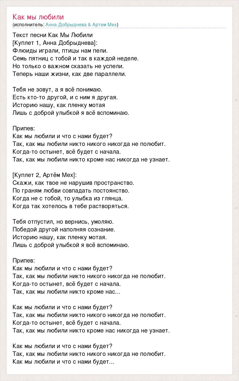 Текст песни Как Мы Любили [Куплет 1, Анна Добрыднева]: Флюиды играли, птицы нам пели. Семь пятниц с тобой и так в каждой неделе. Но только о важном сказать не успели. Теперь наши жизни, как две параллели. Тебя не зовут, а я всё понимаю. Есть кто-то другой, и с ним я другая. Историю нашу, как пленку мотая Лишь с доброй улыбкой я всё вспоминаю. Припев: Как мы любили и что с нами будет? Так, как мы любили никто никого никогда не полюбит. Когда-то остынет, всё будет с начала. Так, как мы любили никто кроме нас никогда не узнает. [Куплет 2, Артём Мех]: Скажи, как твое не нарушив пространство. По граням любви совпадать постоянство. Когда не с тобой, то улыбка из глянца. Когда так хотелось в тебе растворяться. Тебя отпустил, но вернись, умоляю. Победой другой наполняя сознание. Историю нашу, как пленку мотая. Лишь с доброй улыбкой я всё вспоминаю. Припев: Как мы любили и что с нами будет? Так, как мы любили никто никого никогда не полюбит. Когда-то остынет, всё будет с начала. Так, как мы любили никто кроме нас... Как мы любили и что с нами будет? Так, как мы любили никто никого никогда не полюбит. Когда-то остынет, всё будет с начала. Так, как мы любили никто кроме нас никогда не узнает. Как мы любили и что с нами будет? Так, как мы любили никто никого никогда не полюбит. Как мы любили и что с нами будет...