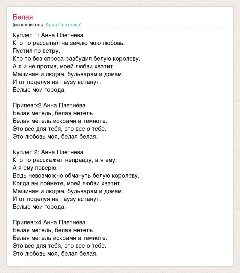 Куплет 1: Анна Плетнёва Кто то рассыпал на землю мою любовь. Пустил по ветру. Кто то без спроса разбудил белую королеву. А я и не против, моей любви хватит. Машинам и людям, бульварам и домам. И от поцелуя на паузу встанут. Белые мои города. Припев:х2 Анна Плетнёва Белая метель, белая метель. Белая метель искрами в темноте. Это все для тебя, это все о тебе. Это любовь моя, белая белая. Куплет 2: Анна Плетнёва Кто то расскажет неправду, а я ему. А я ему поверю. Ведь невозможно обмануть белую королеву. Когда вы поймете, моей любви хватит. Машинам и людям, бульварам и домам. И от поцелуя на паузу встанут. Белые мои города. Припев:х4 Анна Плетнёва Белая метель, белая метель. Белая метель искрами в темноте. Это все для тебя, это все о тебе. Это любовь моя, белая белая.