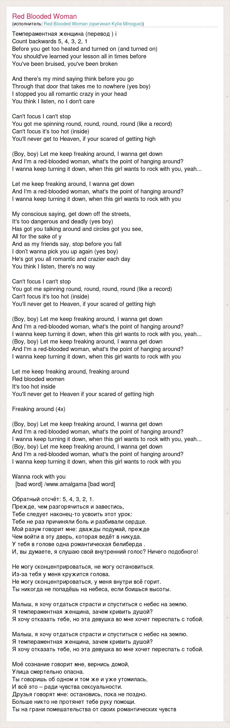 Темпераментная женщина (перевод ) i Сount backwards 5, 4, 3, 2, 1 Before you get too heated and turned on (and turned on) You should've learned your lesson all in times before You've been bruised, you've been broken And there’s my mind saying think before you go Through that door that takes me to nowhere (yes boy) I stopped you all romantic crazy in your head You think I listen, no I don't care Can't focus I can't stop You got me spinning round, round, round, round (like a record) Can't focus it's too hot (inside) You'll never get to Heaven, if your scared of getting high (Boy, boy) Let me keep freaking around, I wanna get down And I'm a red-blooded woman, what's the point of hanging around? I wanna keep turning it down, when this girl wants to rock with you, yeah... Let me keep freaking around, I wanna get down And I'm a red-blooded woman, what's the point of hanging around? I wanna keep turning it down, when this girl wants to rock with you My conscious saying, get down off the streets, It's too dangerous and deadly (yes boy) Has got you talking around and circles got you see, All for the sake of y And as my friends say, stop before you fall I don’t wanna pick you up again (yes boy) He's got you all romantic and crazier each day You think I listen, there's no way Can't focus I can't stop You got me spinning round, round, round, round (like a record) Can't focus it's too hot (inside) You'll never get to Heaven, if your scared of getting high (Boy, boy) Let me keep freaking around, I wanna get down And I'm a red-blooded woman, what's the point of hanging around? I wanna keep turning it down, when this girl wants to rock with you, yeah... (Boy, boy) Let me keep freaking around, I wanna get down And I'm a red-blooded woman, what's the point of hanging around? I wanna keep turning it down, when this girl wants to rock with you Let me keep freaking around, freaking around Red blooded women It's too hot inside You'll never get to Heaven if your scared of getting high Freaking around (4x) (Boy, boy) Let me keep freaking around, I wanna get down And I'm a red-blooded woman, what's the point of hanging around? I wanna keep turning it down, when this girl wants to rock with you, yeah... (Boy, boy) Let me keep freaking around, I wanna get down And I'm a red-blooded woman, what's the point of hanging around? I wanna keep turning it down, when this girl wants to rock with you Wanna rock with you [bad word] /www.amalgama [bad word] Обратный отсчёт: 5, 4, 3, 2, 1. Прежде, чем разгорячиться и завестись, Тебе следует наконец-то усвоить этот урок: Тебе не раз причиняли боль и разбивали сердце. Мой разум говорит мне: дважды подумай, прежде Чем войти в эту дверь, которая ведёт в никуда. У тебя в голове одна романтическая белиберда . И, вы думаете, я слушаю свой внутренний голос? Ничего подобного! Не могу сконцентрироваться, не могу остановиться. Из-за тебя у меня кружится голова. Не могу сконцентрироваться, у меня внутри всё горит. Ты никогда не попадёшь на небеса, если боишься высоты. Малыш, я хочу отдаться страсти и спуститься с небес на землю. Я темпераментная женщина, зачем кривить душой? Я хочу отказать тебе, но эта девушка во мне хочет переспать с тобой. Малыш, я хочу отдаться страсти и спуститься с небес на землю. Я темпераментная женщина, зачем кривить душой? Я хочу отказать тебе, но эта девушка во мне хочет переспать с тобой. Моё сознание говорит мне, вернись домой, Улица смертельно опасна. Ты говоришь об одном и том же и уже утомилась, И всё это – ради чувства сексуальности. Друзья говорят мне: остановись, пока не поздно. Больше никто не протянет тебе руку помощи. Ты на грани помешательства от своих романтических чувств