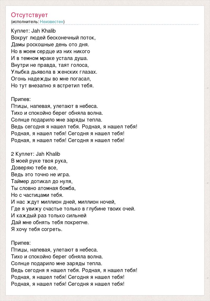 Куплет: Jah Khalib Вокруг людей бесконечный поток, Дамы роскошные день ото дня. Но в моем сердце из них никого И в темном мраке устала душа. Внутри не правда, таят голоса, Улыбка дьявола в женских глазах. Огонь надежды во мне погасал, Но тут внезапно я встретил тебя. Припев: Птицы, напевая, улетают в небеса. Тихо и спокойно берег обняла волна. Солнце подарило мне заряды тепла. Ведь сегодня я нашел тебя. Родная, я нашел тебя! Родная, я нашел тебя! Сегодня я нашел тебя! Родная, я нашел тебя! Сегодня я нашел тебя! 2 Куплет: Jah Khalib В моей руке твоя рука, Доверяю тебе все, Ведь это точно не игра. Таймер дотикал до нуля, Ты словно атомная бомба, Но с частицами тебя. И нас ждут миллион дней, миллион ночей, Где я увижу счастье только в глубине твоих очей. И каждый раз только сильней Дай мне обнять тебя покрепче. Я хочу тебя согреть. Припев: Птицы, напевая, улетают в небеса. Тихо и спокойно берег обняла волна. Солнце подарило мне заряды тепла. Ведь сегодня я нашел тебя. Родная, я нашел тебя! Родная, я нашел тебя! Сегодня я нашел тебя! Родная, я нашел тебя! Сегодня я нашел тебя!