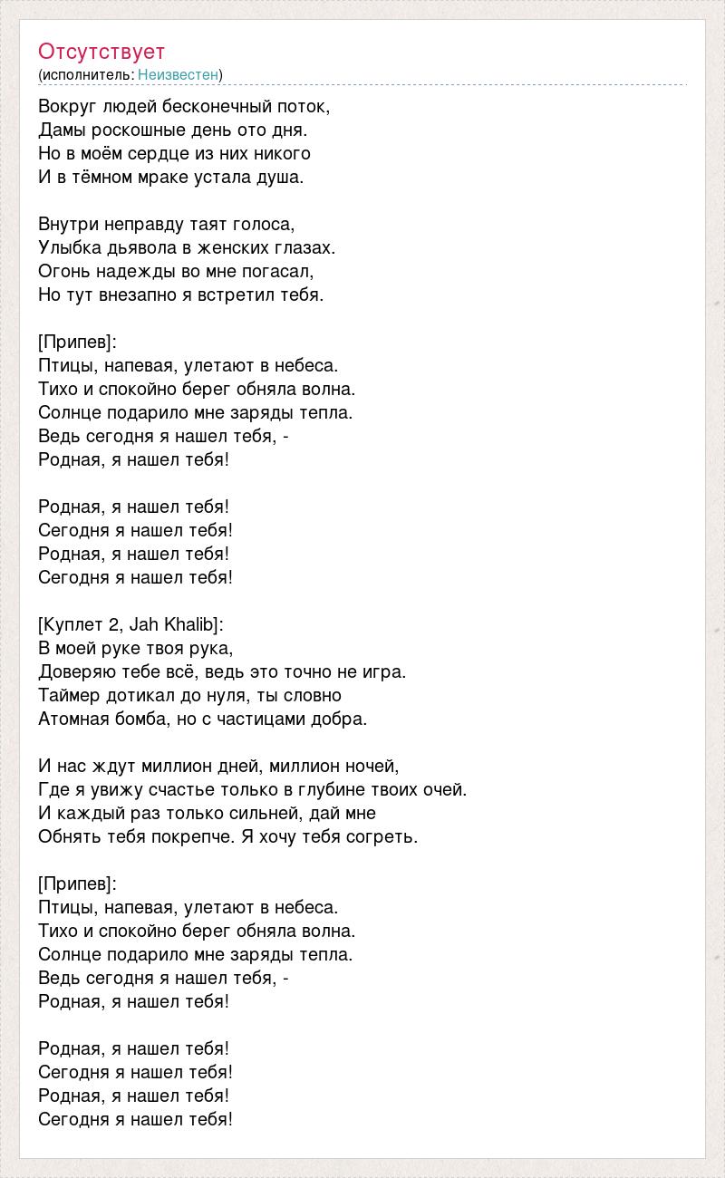 Вокруг людей бесконечный поток, Дамы роскошные день ото дня. Но в моём сердце из них никого И в тёмном мраке устала душа. Внутри неправду таят голоса, Улыбка дьявола в женских глазах. Огонь надежды во мне погасал, Но тут внезапно я встретил тебя. [Припев]: Птицы, напевая, улетают в небеса. Тихо и спокойно берег обняла волна. Солнце подарило мне заряды тепла. Ведь сегодня я нашел тебя, - Родная, я нашел тебя! Родная, я нашел тебя! Сегодня я нашел тебя! Родная, я нашел тебя! Сегодня я нашел тебя! [Куплет 2, Jah Khalib]: В моей руке твоя рука, Доверяю тебе всё, ведь это точно не игра. Таймер дотикал до нуля, ты словно Атомная бомба, но с частицами добра. И нас ждут миллион дней, миллион ночей, Где я увижу счастье только в глубине твоих очей. И каждый раз только сильней, дай мне Обнять тебя покрепче. Я хочу тебя согреть. [Припев]: Птицы, напевая, улетают в небеса. Тихо и спокойно берег обняла волна. Солнце подарило мне заряды тепла. Ведь сегодня я нашел тебя, - Родная, я нашел тебя! Родная, я нашел тебя! Сегодня я нашел тебя! Родная, я нашел тебя! Сегодня я нашел тебя!