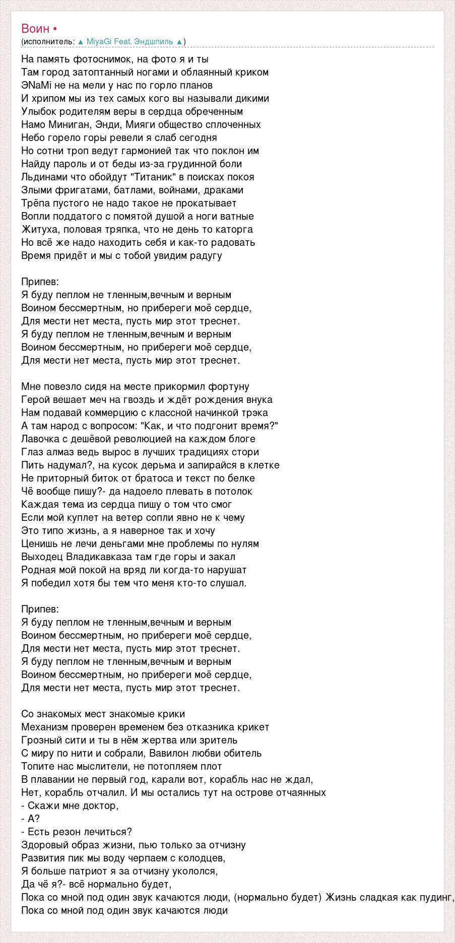 На память фотоснимок, на фото я и ты Там город затоптанный ногами и облаянный криком ЭNaMi не на мели у нас по горло планов И хрипом мы из тех самых кого вы называли дикими Улыбок родителям веры в сердца обреченным Намо Миниган, Энди, Мияги общество сплоченных Небо горело горы ревели я слаб сегодня Но сотни троп ведут гармонией так что поклон им Найду пароль и от беды из-за грудинной боли Льдинами что обойдут "Титаник" в поисках покоя Злыми фригатами, батлами, войнами, драками Трёпа пустого не надо такое не прокатывает Вопли поддатого с помятой душой а ноги ватные Житуха, половая тряпка, что не день то каторга Но всё же надо находить себя и как-то радовать Время придёт и мы с тобой увидим радугу Припев: Я буду пеплом не тленным,вечным и верным Воином бессмертным, но прибереги моё сердце, Для мести нет места, пусть мир этот треснет. Я буду пеплом не тленным,вечным и верным Воином бессмертным, но прибереги моё сердце, Для мести нет места, пусть мир этот треснет. Мне повезло сидя на месте прикормил фортуну Герой вешает меч на гвоздь и ждёт рождения внука Нам подавай коммерцию с классной начинкой трэка А там народ с вопросом: "Как, и что подгонит время?" Лавочка с дешёвой революцией на каждом блоге Глаз алмаз ведь вырос в лучших традициях стори Пить надумал?, на кусок дерьма и запирайся в клетке Не приторный биток от братоса и текст по белке Чё вообще пишу?- да надоело плевать в потолок Каждая тема из сердца пишу о том что смог Если мой куплет на ветер сопли явно не к чему Это типо жизнь, а я наверное так и хочу Ценишь не лечи деньгами мне проблемы по нулям Выходец Владикавказа там где горы и закал Родная мой покой на вряд ли когда-то нарушат Я победил хотя бы тем что меня кто-то слушал. Припев: Я буду пеплом не тленным,вечным и верным Воином бессмертным, но прибереги моё сердце, Для мести нет места, пусть мир этот треснет. Я буду пеплом не тленным,вечным и верным Воином бессмертным, но прибереги моё сердце, Для мести нет места, пусть мир этот треснет. Со знакомых мест знакомые крики Механизм проверен временем без отказника крикет Грозный сити и ты в нём жертва или зритель С миру по нити и собрали, Вавилон любви обитель Топите нас мыслители, не потопляем плот В плавании не первый год, карали вот, корабль нас не ждал, Нет, корабль отчалил. И мы остались тут на острове отчаянных - Скажи мне доктор, - А? - Есть резон лечиться? Здоровый образ жизни, пью только за отчизну Развития пик мы воду черпаем с колодцев, Я больше патриот я за отчизну укололся, Да чё я?- всё нормально будет, Пока со мной под один звук качаются люди, (нормально будет) Жизнь сладкая как пудинг, Пока со мной под один звук качаются люди