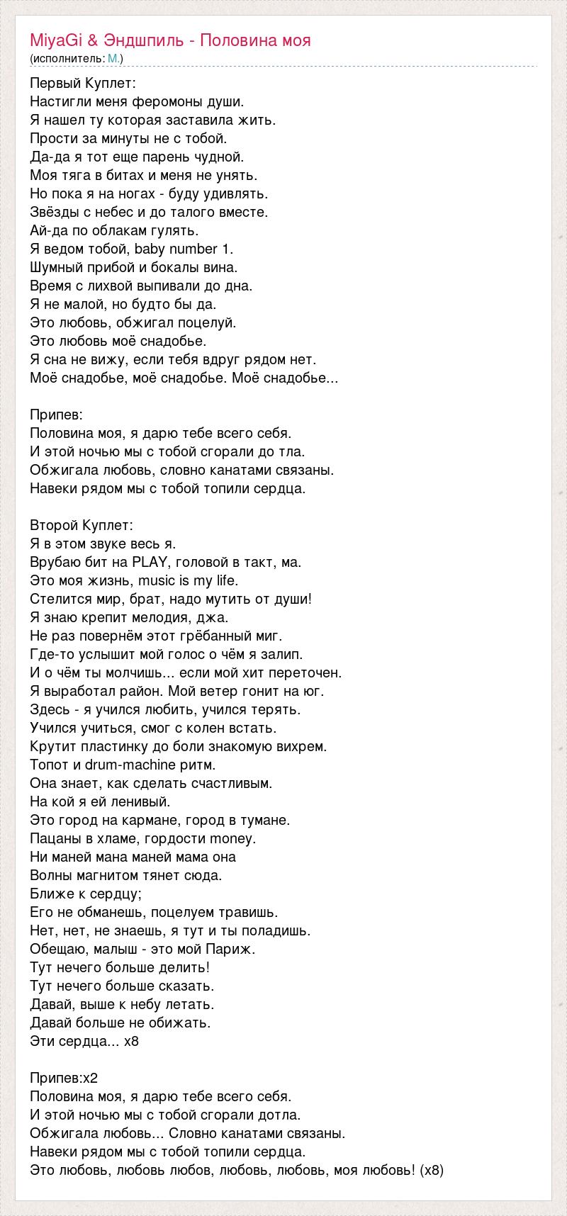Первый Куплет: Настигли меня феромоны души. Я нашел ту которая заставила жить. Прости за минуты не с тобой. Да-да я тот еще парень чудной. Моя тяга в битах и меня не унять. Но пока я на ногах - буду удивлять. Звёзды с небес и до талого вместе. Ай-да по облакам гулять. Я ведом тобой, baby number 1. Шумный прибой и бокалы вина. Время с лихвой выпивали до дна. Я не малой, но будто бы да. Это любовь, обжигал поцелуй. Это любовь моё снадобье. Я сна не вижу, если тебя вдруг рядом нет. Моё снадобье, моё снадобье. Моё снадобье... Припев: Половина моя, я дарю тебе всего себя. И этой ночью мы с тобой сгорали до тла. Обжигала любовь, словно канатами связаны. Навеки рядом мы с тобой топили сердца. Второй Куплет: Я в этом звуке весь я. Врубаю бит на PLAY, головой в такт, ма. Это моя жизнь, music is my life. Стелится мир, брат, надо мутить от души! Я знаю крепит мелодия, джа. Не раз повернём этот грёбанный миг. Где-то услышит мой голос о чём я залип. И о чём ты молчишь... если мой хит переточен. Я выработал район. Мой ветер гонит на юг. Здесь - я учился любить, учился терять. Учился учиться, смог с колен встать. Крутит пластинку до боли знакомую вихрем. Топот и drum-machine ритм. Она знает, как сделать счастливым. На кой я ей ленивый. Это город на кармане, город в тумане. Пацаны в хламе, гордости money. Ни маней мана маней мама она Волны магнитом тянет сюда. Ближе к сердцу; Его не обманешь, поцелуем травишь. Нет, нет, не знаешь, я тут и ты поладишь. Обещаю, малыш - это мой Париж. Тут нечего больше делить! Тут нечего больше сказать. Давай, выше к небу летать. Давай больше не обижать. Эти сердца... x8 Припев:x2 Половина моя, я дарю тебе всего себя. И этой ночью мы с тобой сгорали дотла. Обжигала любовь... Словно канатами связаны. Навеки рядом мы с тобой топили сердца. Это любовь, любовь любов, любовь, любовь, моя любовь! (х8)
