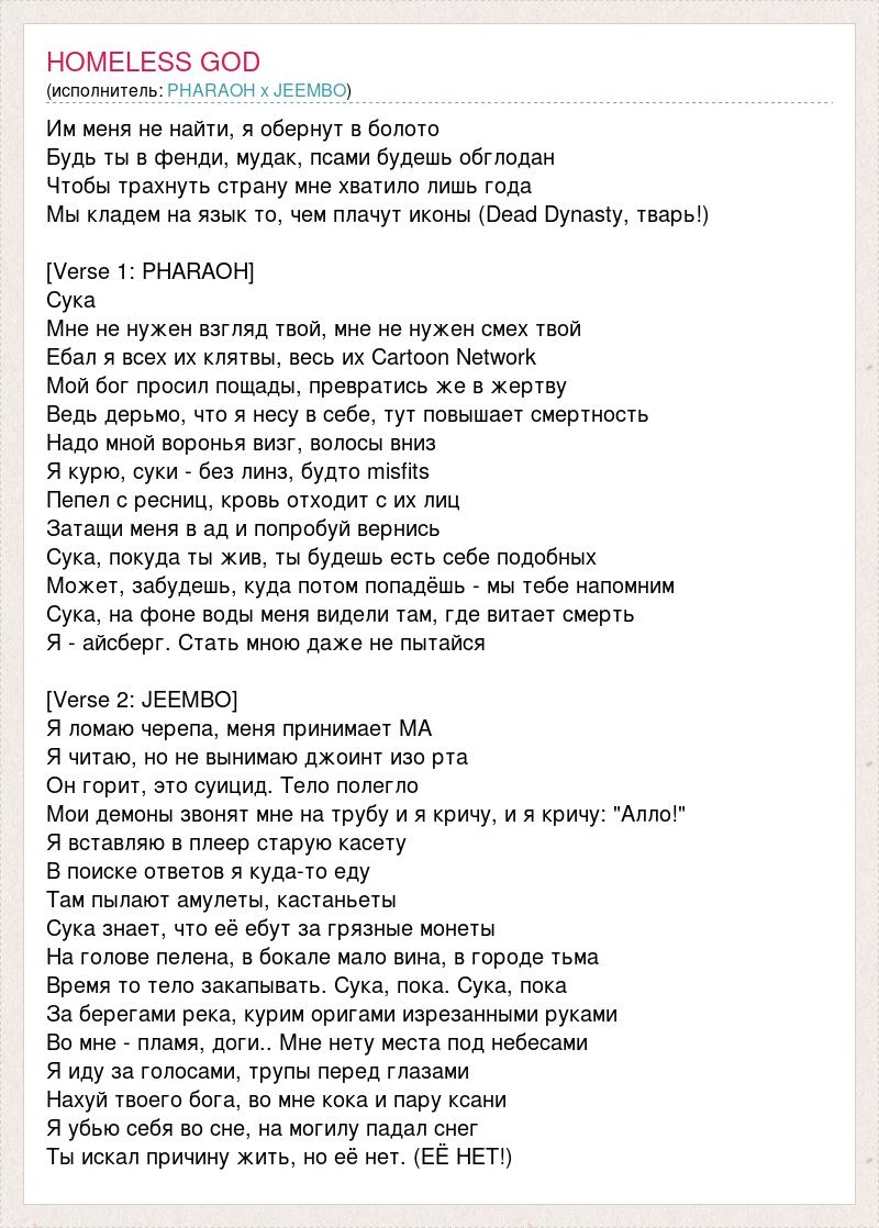 Им меня не найти, я обернут в болото Будь ты в фенди, мудак, псами будешь обглодан Чтобы трахнуть страну мне хватило лишь года Мы кладем на язык то, чем плачут иконы (Dead Dynasty, тварь!) [Verse 1: PHARAOH] Сука Мне не нужен взгляд твой, мне не нужен смех твой Ебал я всех их клятвы, весь их Cartoon Network Мой бог просил пощады, превратись же в жертву Ведь дерьмо, что я несу в себе, тут повышает смертность Надо мной воронья визг, волосы вниз Я курю, суки - без линз, будто misfits Пепел с ресниц, кровь отходит с их лиц Затащи меня в ад и попробуй вернись Сука, покуда ты жив, ты будешь есть себе подобных Может, забудешь, куда потом попадёшь - мы тебе напомним Сука, на фоне воды меня видели там, где витает смерть Я - айсберг. Стать мною даже не пытайся [Verse 2: JEEMBO] Я ломаю черепа, меня принимает МА Я читаю, но не вынимаю джоинт изо рта Он горит, это суицид. Тело полегло Мои демоны звонят мне на трубу и я кричу, и я кричу: "Алло!" Я вставляю в плеер старую касету В поиске ответов я куда-то еду Там пылают амулеты, кастаньеты Сука знает, что её ебут за грязные монеты На голове пелена, в бокале мало вина, в городе тьма Время то тело закапывать. Сука, пока. Сука, пока За берегами река, курим оригами изрезанными руками Во мне - пламя, доги.. Мне нету места под небесами Я иду за голосами, трупы перед глазами Нахуй твоего бога, во мне кока и пару ксани Я убью себя во сне, на могилу падал снег Ты искал причину жить, но её нет. (ЕЁ НЕТ!)