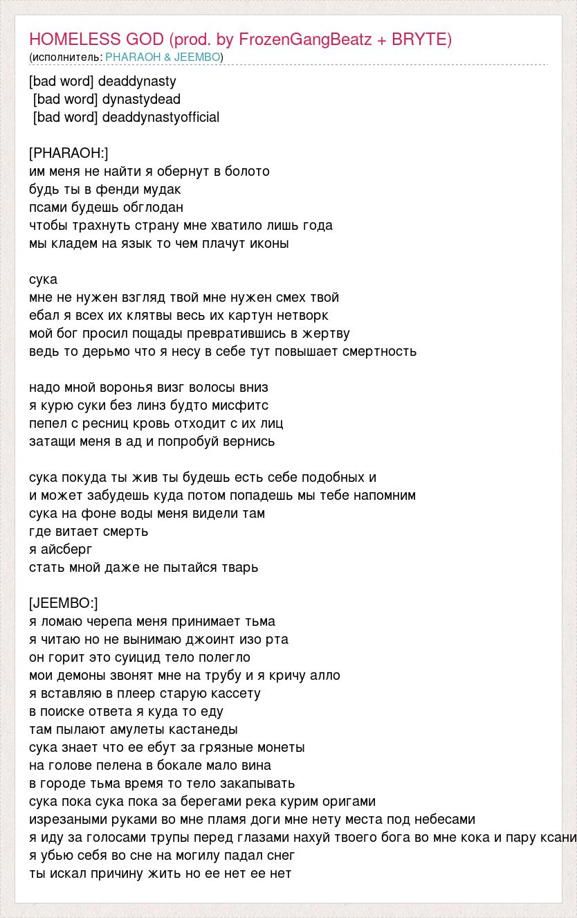 [bad word] deaddynasty [bad word] dynastydead [bad word] deaddynastyofficial [PHARAOH:] им меня не найти я обернут в болото будь ты в фенди мудак псами будешь обглодан чтобы трахнуть страну мне хватило лишь года мы кладем на язык то чем плачут иконы сука мне не нужен взгляд твой мне нужен смех твой ебал я всех их клятвы весь их картун нетворк мой бог просил пощады превратившись в жертву ведь то дерьмо что я несу в себе тут повышает смертность надо мной воронья визг волосы вниз я курю суки без линз будто мисфитс пепел с ресниц кровь отходит с их лиц затащи меня в ад и попробуй вернись cука покуда ты жив ты будешь есть себе подобных и и может забудешь куда потом попадешь мы тебе напомним сука на фоне воды меня видели там где витает смерть я айсберг стать мной даже не пытайся тварь [JEEMBO:] я ломаю черепа меня принимает тьма я читаю но не вынимаю джоинт изо рта он горит это суицид тело полегло мои демоны звонят мне на трубу и я кричу алло я вставляю в плеер старую кассету в поиске ответа я куда то еду там пылают амулеты кастанеды сука знает что ее ебут за грязные монеты на голове пелена в бокале мало вина в городе тьма время то тело закапывать сука пока сука пока за берегами река курим оригами изрезаными руками во мне пламя доги мне нету места под небесами я иду за голосами трупы перед глазами нахуй твоего бога во мне кока и пару ксани я убью себя во сне на могилу падал снег ты искал причину жить но ее нет ее нет