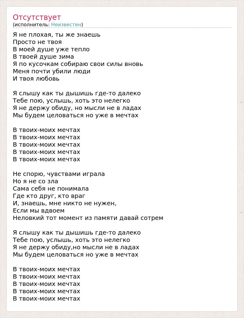 Я не плохая, ты же знаешь Просто не твоя В моей душе уже тепло В твоей душе зима Я по кусочкам собираю свои силы вновь Меня почти убили люди И твоя любовь Я слышу как ты дышишь где-то далеко Тебе пою, услышь, хоть это нелегко Я не держу обиду, но мысли не в ладах Мы будем целоваться но уже в мечтах В твоих-моих мечтах В твоих-моих мечтах В твоих-моих мечтах В твоих-моих мечтах В твоих-моих мечтах Не спорю, чувствами играла Но я не со зла Сама себя не понимала Где кто друг, кто враг И, знаешь, мне никто не нужен, Если мы вдвоем Неловкий тот момент из памяти давай сотрем Я слышу как ты дышишь где-то далеко Тебе пою, услышь, хоть это нелегко Я не держу обиду,но мысли не в ладах Мы будем целоваться но уже в мечтах В твоих-моих мечтах В твоих-моих мечтах В твоих-моих мечтах В твоих-моих мечтах В твоих-моих мечтах
