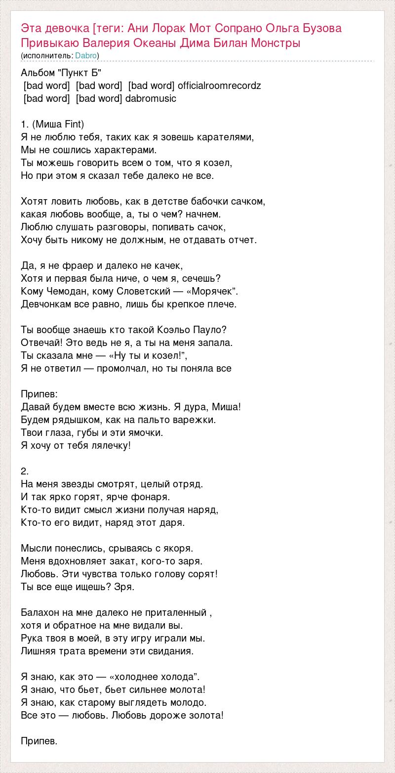 Альбом "Пункт Б" [bad word] [bad word] [bad word] officialroomrecordz [bad word] [bad word] dabromusic 1. (Миша Fint) Я не люблю тебя, таких как я зовешь карателями, Мы не сошлись характерами. Ты можешь говорить всем о том, что я козел, Но при этом я сказал тебе далеко не все. Хотят ловить любовь, как в детстве бабочки сачком, какая любовь вообще, а, ты о чем? начнем. Люблю слушать разговоры, попивать сачок, Хочу быть никому не должным, не отдавать отчет. Да, я не фраер и далеко не качек, Хотя и первая была ниче, о чем я, сечешь? Кому Чемодан, кому Словетский — «Морячек”. Девчонкам все равно, лишь бы крепкое плече. Ты вообще знаешь кто такой Коэльо Пауло? Отвечай! Это ведь не я, а ты на меня запала. Ты сказала мне — «Ну ты и козел!”, Я не ответил — промолчал, но ты поняла все Припев: Давай будем вместе всю жизнь. Я дура, Миша! Будем рядышком, как на пальто варежки. Твои глаза, губы и эти ямочки. Я хочу от тебя лялечку! 2. На меня звезды смотрят, целый отряд. И так ярко горят, ярче фонаря. Кто-то видит смысл жизни получая наряд, Кто-то его видит, наряд этот даря. Мысли понеслись, срываясь с якоря. Меня вдохновляет закат, кого-то заря. Любовь. Эти чувства только голову сорят! Ты все еще ищешь? Зря. Балахон на мне далеко не приталенный , хотя и обратное на мне видали вы. Рука твоя в моей, в эту игру играли мы. Лишняя трата времени эти свидания. Я знаю, как это — «холоднее холода”. Я знаю, что бьет, бьет сильнее молота! Я знаю, как старому выглядеть молодо. Все это — любовь. Любовь дороже золота! Припев.