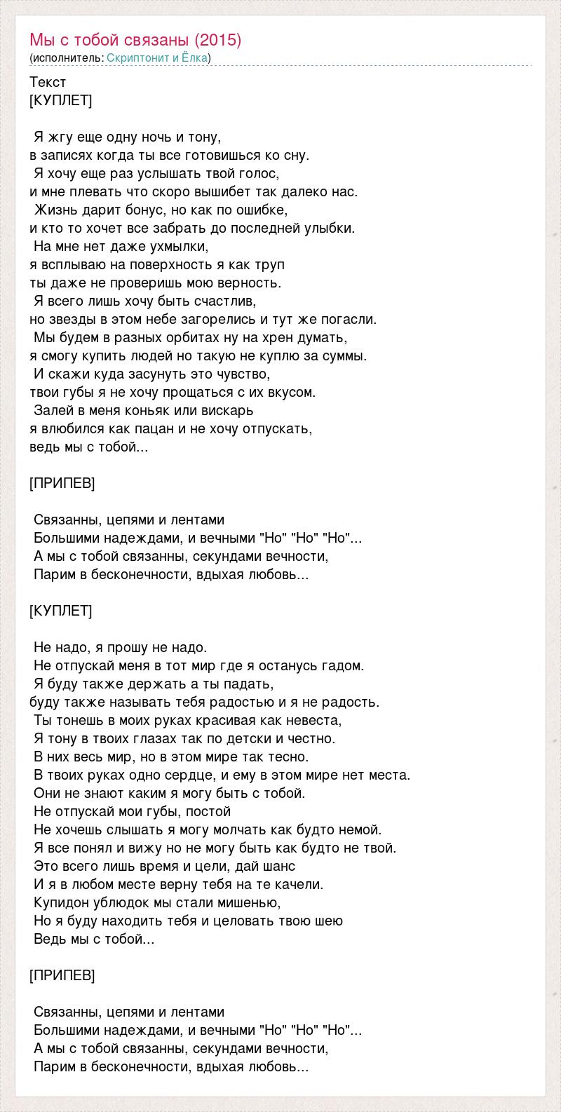 Текст [КУПЛЕТ] Я жгу еще одну ночь и тону, в записях когда ты все готовишься ко сну. Я хочу еще раз услышать твой голос, и мне плевать что скоро вышибет так далеко нас. Жизнь дарит бонус, но как по ошибке, и кто то хочет все забрать до последней улыбки. На мне нет даже ухмылки, я всплываю на поверхность я как труп ты даже не проверишь мою верность. Я всего лишь хочу быть счастлив, но звезды в этом небе загорелись и тут же погасли. Мы будем в разных орбитах ну на хрен думать, я смогу купить людей но такую не куплю за суммы. И скажи куда засунуть это чувство, твои губы я не хочу прощаться с их вкусом. Залей в меня коньяк или вискарь я влюбился как пацан и не хочу отпускать, ведь мы с тобой... [ПРИПЕВ] Связанны, цепями и лентами Большими надеждами, и вечными "Но" "Но" "Но"... А мы с тобой связанны, секундами вечности, Парим в бесконечности, вдыхая любовь... [КУПЛЕТ] Не надо, я прошу не надо. Не отпускай меня в тот мир где я останусь гадом. Я буду также держать а ты падать, буду также называть тебя радостью и я не радость. Ты тонешь в моих руках красивая как невеста, Я тону в твоих глазах так по детски и честно. В них весь мир, но в этом мире так тесно. В твоих руках одно сердце, и ему в этом мире нет места. Они не знают каким я могу быть с тобой. Не отпускай мои губы, постой Не хочешь слышать я могу молчать как будто немой. Я все понял и вижу но не могу быть как будто не твой. Это всего лишь время и цели, дай шанс И я в любом месте верну тебя на те качели. Купидон ублюдок мы стали мишенью, Но я буду находить тебя и целовать твою шею Ведь мы с тобой... [ПРИПЕВ] Связанны, цепями и лентами Большими надеждами, и вечными "Но" "Но" "Но"... А мы с тобой связанны, секундами вечности, Парим в бесконечности, вдыхая любовь...