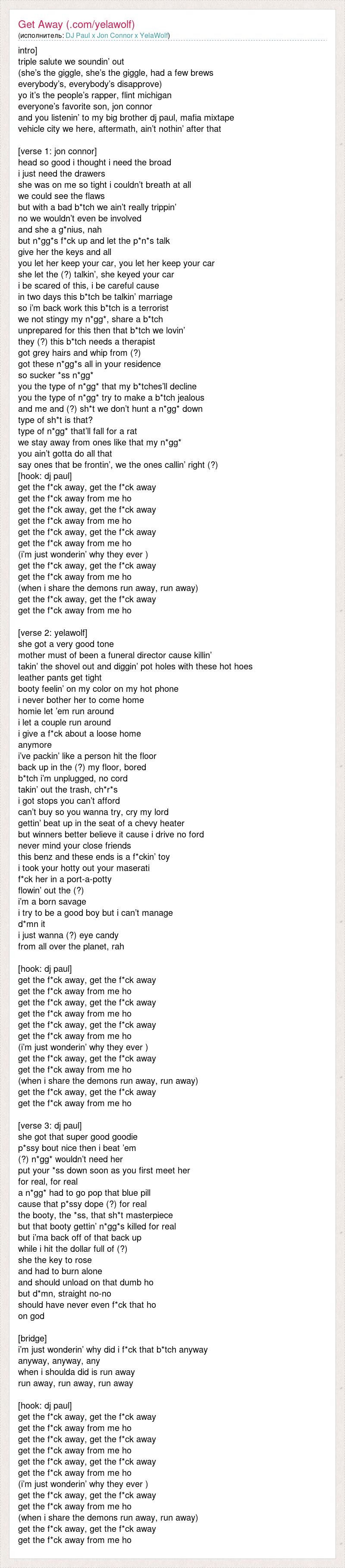 intro] triple salute we soundin’ out (she’s the giggle, she’s the giggle, had a few brews everybody’s, everybody’s disapprove) yo it’s the people’s rapper, flint michigan everyone’s favorite son, jon connor and you listenin’ to my big brother dj paul, mafia mixtape vehicle city we here, aftermath, ain’t nothin’ after that [verse 1: jon connor] head so good i thought i need the broad i just need the drawers she was on me so tight i couldn’t breath at all we could see the flaws but with a bad b*tch we ain’t really trippin’ no we wouldn’t even be involved and she a g*nius, nah but n*gg*s f*ck up and let the p*n*s talk give her the keys and all you let her keep your car, you let her keep your car she let the (?) talkin’, she keyed your car i be scared of this, i be careful cause in two days this b*tch be talkin’ marriage so i’m back work this b*tch is a terrorist we not stingy my n*gg*, share a b*tch unprepared for this then that b*tch we lovin’ they (?) this b*tch needs a therapist got grey hairs and whip from (?) got these n*gg*s all in your residence so sucker *ss n*gg* you the type of n*gg* that my b*tches’ll decline you the type of n*gg* try to make a b*tch jealous and me and (?) sh*t we don’t hunt a n*gg* down type of sh*t is that? type of n*gg* that’ll fall for a rat we stay away from ones like that my n*gg* you ain’t gotta do all that say ones that be frontin’, we the ones callin’ right (?) [hook: dj paul] get the f*ck away, get the f*ck away get the f*ck away from me ho get the f*ck away, get the f*ck away get the f*ck away from me ho get the f*ck away, get the f*ck away get the f*ck away from me ho (i’m just wonderin’ why they ever ) get the f*ck away, get the f*ck away get the f*ck away from me ho (when i share the demons run away, run away) get the f*ck away, get the f*ck away get the f*ck away from me ho [verse 2: yelawolf] she got a very good tone mother must of been a funeral director cause killin’ takin’ the shovel out and diggin’ pot holes with these hot hoes leather pants get tight booty feelin’ on my color on my hot phone i never bother her to come home homie let ’em run around i let a couple run around i give a f*ck about a loose home anymore i’ve packin’ like a person hit the floor back up in the (?) my floor, bored b*tch i’m unplugged, no cord takin’ out the trash, ch*r*s i got stops you can’t afford can’t buy so you wanna try, cry my lord gettin’ beat up in the seat of a chevy heater but winners better believe it cause i drive no ford never mind your close friends this benz and these ends is a f*ckin’ toy i took your hotty out your maserati f*ck her in a port-a-potty flowin’ out the (?) i’m a born savage i try to be a good boy but i can’t manage d*mn it i just wanna (?) eye candy from all over the planet, rah [hook: dj paul] get the f*ck away, get the f*ck away get the f*ck away from me ho get the f*ck away, get the f*ck away get the f*ck away from me ho get the f*ck away, get the f*ck away get the f*ck away from me ho (i’m just wonderin’ why they ever ) get the f*ck away, get the f*ck away get the f*ck away from me ho (when i share the demons run away, run away) get the f*ck away, get the f*ck away get the f*ck away from me ho [verse 3: dj paul] she got that super good goodie p*ssy bout nice then i beat ’em (?) n*gg* wouldn’t need her put your *ss down soon as you first meet her for real, for real a n*gg* had to go pop that blue pill cause that p*ssy dope (?) for real the booty, the *ss, that sh*t masterpiece but that booty gettin’ n*gg*s killed for real but i’ma back off of that back up while i hit the dollar full of (?) she the key to rose and had to burn alone and should unload on that dumb ho but d*mn, straight no-no should have never even f*ck that ho on god [bridge] i’m just wonderin’ why did i f*ck that b*tch anyway anyway, anyway, any when i shoulda did is run away run away, run away, run away [hook: dj paul] get the f*ck away, get the f*ck away get the f*ck away from me ho get the f*ck away, get the f*ck away get the f*ck away from me ho get the f*ck away, get the f*ck away get the f*ck away from me ho (i’m just wonderin’ why they ever ) get the f*ck away, get the f*ck away get the f*ck away from me ho (when i share the demons run away, run away) get the f*ck away, get the f*ck away get the f*ck away from me ho