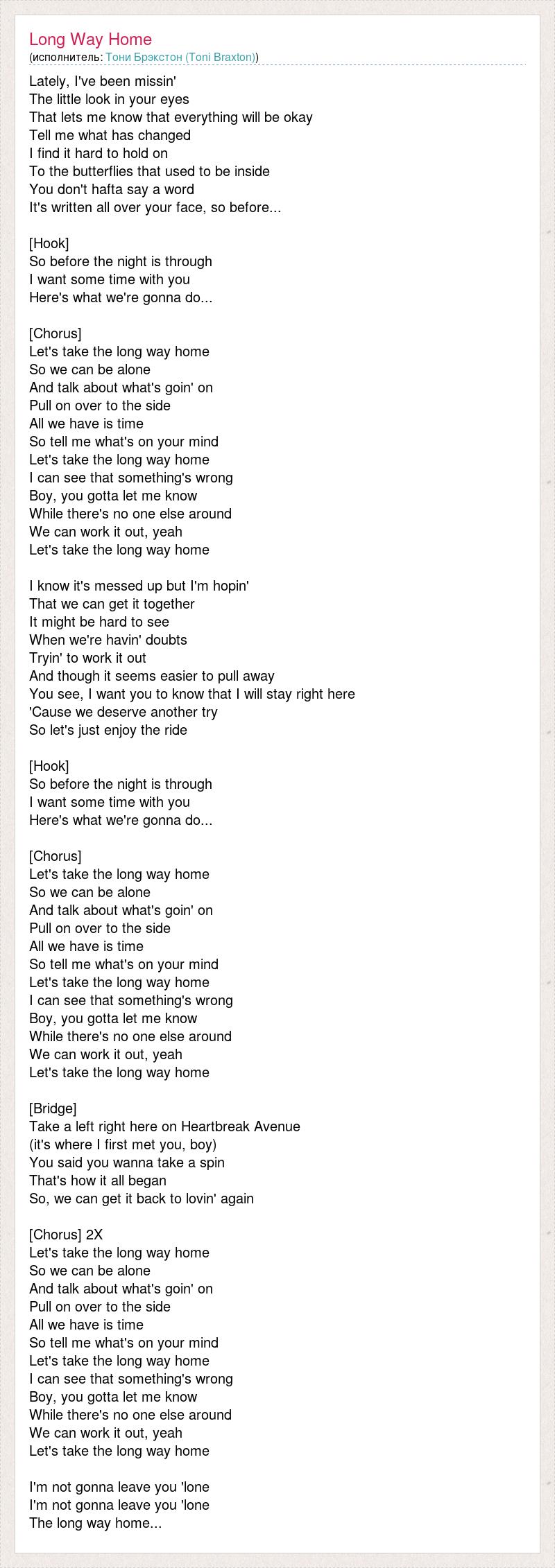Lately, I've been missin' The little look in your eyes That lets me know that everything will be okay Tell me what has changed I find it hard to hold on To the butterflies that used to be inside You don't hafta say a word It's written all over your face, so before... [Hook] So before the night is through I want some time with you Here's what we're gonna do... [Chorus] Let's take the long way home So we can be alone And talk about what's goin' on Pull on over to the side All we have is time So tell me what's on your mind Let's take the long way home I can see that something's wrong Boy, you gotta let me know While there's no one else around We can work it out, yeah Let's take the long way home I know it's messed up but I'm hopin' That we can get it together It might be hard to see When we're havin' doubts Tryin' to work it out And though it seems easier to pull away You see, I want you to know that I will stay right here 'Cause we deserve another try So let's just enjoy the ride [Hook] So before the night is through I want some time with you Here's what we're gonna do... [Chorus] Let's take the long way home So we can be alone And talk about what's goin' on Pull on over to the side All we have is time So tell me what's on your mind Let's take the long way home I can see that something's wrong Boy, you gotta let me know While there's no one else around We can work it out, yeah Let's take the long way home [Bridge] Take a left right here on Heartbreak Avenue (it's where I first met you, boy) You said you wanna take a spin That's how it all began So, we can get it back to lovin' again [Chorus] 2X Let's take the long way home So we can be alone And talk about what's goin' on Pull on over to the side All we have is time So tell me what's on your mind Let's take the long way home I can see that something's wrong Boy, you gotta let me know While there's no one else around We can work it out, yeah Let's take the long way home I'm not gonna leave you 'lone I'm not gonna leave you 'lone The long way home...