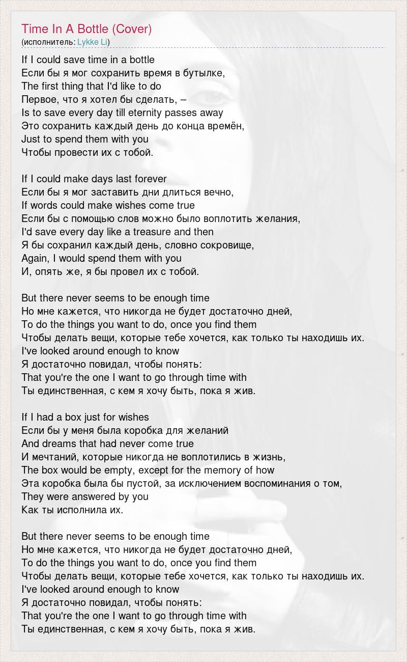 If I could save time in a bottle Если бы я мог сохранить время в бутылке, The first thing that I'd like to do Первое, что я хотел бы сделать, – Is to save every day till eternity passes away Это сохранить каждый день до конца времён, Just to spend them with you Чтобы провести их с тобой. If I could make days last forever Если бы я мог заставить дни длиться вечно, If words could make wishes come true Если бы с помощью слов можно было воплотить желания, I'd save every day like a treasure and then Я бы сохранил каждый день, словно сокровище, Again, I would spend them with you И, опять же, я бы провел их с тобой. But there never seems to be enough time Но мне кажется, что никогда не будет достаточно дней, To do the things you want to do, once you find them Чтобы делать вещи, которые тебе хочется, как только ты находишь их. I've looked around enough to know Я достаточно повидал, чтобы понять: That you're the one I want to go through time with Ты единственная, с кем я хочу быть, пока я жив. If I had a box just for wishes Если бы у меня была коробка для желаний And dreams that had never come true И мечтаний, которые никогда не воплотились в жизнь, The box would be empty, except for the memory of how Эта коробка была бы пустой, за исключением воспоминания о том, They were answered by you Как ты исполнила их. But there never seems to be enough time Но мне кажется, что никогда не будет достаточно дней, To do the things you want to do, once you find them Чтобы делать вещи, которые тебе хочется, как только ты находишь их. I've looked around enough to know Я достаточно повидал, чтобы понять: That you're the one I want to go through time with Ты единственная, с кем я хочу быть, пока я жив.