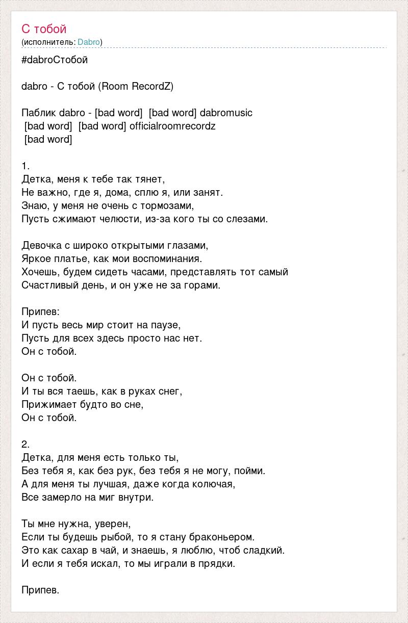 #dabroСтобой dabro - С тобой (Room RecordZ) Паблик dabro - [bad word] [bad word] dabromusic [bad word] [bad word] officialroomrecordz [bad word] 1. Детка, меня к тебе так тянет, Не важно, где я, дома, сплю я, или занят. Знаю, у меня не очень с тормозами, Пусть сжимают челюсти, из-за кого ты со слезами. Девочка с широко открытыми глазами, Яркое платье, как мои воспоминания. Хочешь, будем сидеть часами, представлять тот самый Счастливый день, и он уже не за горами. Припев: И пусть весь мир стоит на паузе, Пусть для всех здесь просто нас нет. Он с тобой. Он с тобой. И ты вся таешь, как в руках снег, Прижимает будто во сне, Он с тобой. 2. Детка, для меня есть только ты, Без тебя я, как без рук, без тебя я не могу, пойми. А для меня ты лучшая, даже когда колючая, Все замерло на миг внутри. Ты мне нужна, уверен, Если ты будешь рыбой, то я стану браконьером. Это как сахар в чай, и знаешь, я люблю, чтоб сладкий. И если я тебя искал, то мы играли в прядки. Припев.