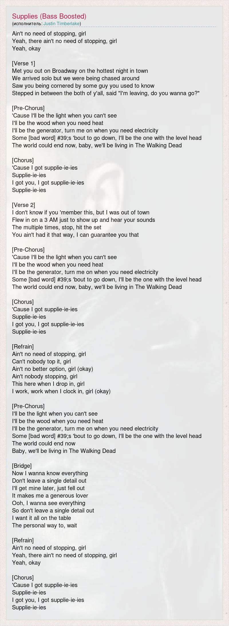 Ain't no need of stopping, girl Yeah, there ain't no need of stopping, girl Yeah, okay [Verse 1] Met you out on Broadway on the hottest night in town We arrived solo but we were being chased around Saw you being cornered by some guy you used to know Stepped in between the both of y'all, said "I'm leaving, do you wanna go?" [Pre-Chorus] 'Cause I'll be the light when you can't see I'll be the wood when you need heat I'll be the generator, turn me on when you need electricity Some [bad word] #39;s 'bout to go down, I'll be the one with the level head The world could end now, baby, we'll be living in The Walking Dead [Chorus] 'Cause I got supplie-ie-ies Supplie-ie-ies I got you, I got supplie-ie-ies Supplie-ie-ies [Verse 2] I don't know if you 'member this, but I was out of town Flew in on a 3 AM just to show up and hear your sounds The multiple times, stop, hit the set You ain't had it that way, I can guarantee you that [Pre-Chorus] 'Cause I'll be the light when you can't see I'll be the wood when you need heat I'll be the generator, turn me on when you need electricity Some [bad word] #39;s 'bout to go down, I'll be the one with the level head The world could end now, baby, we'll be living in The Walking Dead [Chorus] 'Cause I got supplie-ie-ies Supplie-ie-ies I got you, I got supplie-ie-ies Supplie-ie-ies [Refrain] Ain't no need of stopping, girl Can't nobody top it, girl Ain't no better option, girl (okay) Ain't nobody stopping, girl This here when I drop in, girl I work, work when I clock in, girl (okay) [Pre-Chorus] I'll be the light when you can't see I'll be the wood when you need heat I'll be the generator, turn me on when you need electricity Some [bad word] #39;s 'bout to go down, I'll be the one with the level head The world could end now Baby, we'll be living in The Walking Dead [Bridge] Now I wanna know everything Don't leave a single detail out I'll get mine later, just fell out It makes me a generous lover Ooh, I wanna see everything So don't leave a single detail out I want it all on the table The personal way to, wait [Refrain] Ain't no need of stopping, girl Yeah, there ain't no need of stopping, girl Yeah, okay [Chorus] 'Cause I got supplie-ie-ies Supplie-ie-ies I got you, I got supplie-ie-ies Supplie-ie-ies