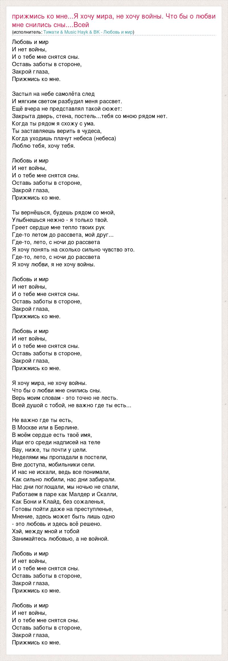 Любовь и мир И нет войны, И о тебе мне снятся сны. Оставь заботы в стороне, Закрой глаза, Прижмись ко мне. Застыл на небе самолёта след И мягким светом разбудил меня рассвет. Ещё вчера не представлял такой сюжет: Закрыта дверь, стена, постель...тебя со мною рядом нет. Когда ты рядом я схожу с ума. Ты заставляешь верить в чудеса, Когда уходишь плачут небеса (небеса) Люблю тебя, хочу тебя. Любовь и мир И нет войны, И о тебе мне снятся сны. Оставь заботы в стороне, Закрой глаза, Прижмись ко мне. Ты вернёшься, будешь рядом со мной, Улыбнешься нежно - я только твой. Греет сердце мне тепло твоих рук Где-то летом до рассвета, мой друг... Где-то, лето, с ночи до рассвета Я хочу понять на сколько сильно чувство это. Где-то, лето, с ночи до рассвета Я хочу любви, я не хочу войны. Любовь и мир И нет войны, И о тебе мне снятся сны. Оставь заботы в стороне, Закрой глаза, Прижмись ко мне. Любовь и мир И нет войны, И о тебе мне снятся сны. Оставь заботы в стороне, Закрой глаза, Прижмись ко мне. Я хочу мира, не хочу войны. Что бы о любви мне снились сны. Верь моим словам - это точно не лесть. Всей душой с тобой, не важно где ты есть... Не важно где ты есть, В Москве или в Берлине. В моём сердце есть твоё имя, Ищи его среди надписей на теле Вау, ниже, ты почти у цели. Неделями мы пропадали в постели, Вне доступа, мобильники сели. И нас не искали, ведь все понимали, Как сильно любили, нас дни забирали. Нас дни поглощали, мы ночью не спали, Работаем в паре как Малдер и Скалли, Как Бони и Клайд, без сожаленья, Готовы пойти даже на преступленье, Мнение, здесь может быть лишь одно - это любовь и здесь всё решено. Хэй, между мной и тобой Занимайтесь любовью, а не войной. Любовь и мир И нет войны, И о тебе мне снятся сны. Оставь заботы в стороне, Закрой глаза, Прижмись ко мне. Любовь и мир И нет войны, И о тебе мне снятся сны. Оставь заботы в стороне, Закрой глаза, Прижмись ко мне.