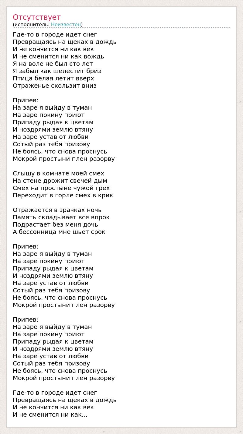Где-то в городе идет снег Превращаясь на щеках в дождь И не кончится ни как век И не сменится ни как вождь Я на воле не был сто лет Я забыл как шелестит бриз Птица белая летит вверх Отраженье скользит вниз Припев: На заре я выйду в туман На заре покину приют Припаду рыдая к цветам И ноздрями землю втяну На заре устав от любви Сотый раз тебя призову Не боясь, что снова проснусь Мокрой простыни плен разорву Слышу в комнате моей смех На стене дрожит свечей дым Смех на простыне чужой грех Переходит в горле смех в крик Отражается в зрачках ночь Память складывает все впрок Подрастает без меня дочь А бессонница мне шьет срок Припев: На заре я выйду в туман На заре покину приют Припаду рыдая к цветам И ноздрями землю втяну На заре устав от любви Сотый раз тебя призову Не боясь, что снова проснусь Мокрой простыни плен разорву Припев: На заре я выйду в туман На заре покину приют Припаду рыдая к цветам И ноздрями землю втяну На заре устав от любви Сотый раз тебя призову Не боясь, что снова проснусь Мокрой простыни плен разорву Где-то в городе идет снег Превращаясь на щеках в дождь И не кончится ни как век И не сменится ни как...
