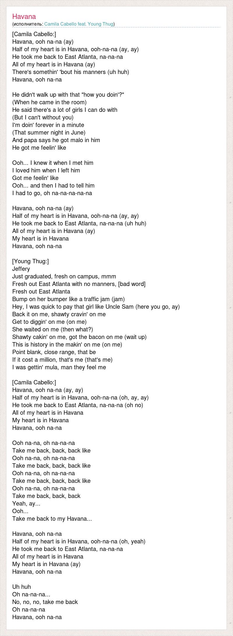 [Camila Cabello:] Havana, ooh na-na (ay) Half of my heart is in Havana, ooh-na-na (ay, ay) He took me back to East Atlanta, na-na-na All of my heart is in Havana (ay) There's somethin' 'bout his manners (uh huh) Havana, ooh na-na He didn't walk up with that "how you doin'?" (When he came in the room) He said there's a lot of girls I can do with (But I can't without you) I'm doin' forever in a minute (That summer night in June) And papa says he got malo in him He got me feelin' like Ooh... I knew it when I met him I loved him when I left him Got me feelin' like Ooh... and then I had to tell him I had to go, oh na-na-na-na-na Havana, ooh na-na (ay) Half of my heart is in Havana, ooh-na-na (ay, ay) He took me back to East Atlanta, na-na-na (uh huh) All of my heart is in Havana (ay) My heart is in Havana Havana, ooh na-na [Young Thug:] Jeffery Just graduated, fresh on campus, mmm Fresh out East Atlanta with no manners, [bad word] Fresh out East Atlanta Bump on her bumper like a traffic jam (jam) Hey, I was quick to pay that girl like Uncle Sam (here you go, ay) Back it on me, shawty cravin' on me Get to diggin' on me (on me) She waited on me (then what?) Shawty cakin' on me, got the bacon on me (wait up) This is history in the makin' on me (on me) Point blank, close range, that be If it cost a million, that's me (that's me) I was gettin' mula, man they feel me [Camila Cabello:] Havana, ooh na-na (ay, ay) Half of my heart is in Havana, ooh-na-na (oh, ay, ay) He took me back to East Atlanta, na-na-na (oh no) All of my heart is in Havana My heart is in Havana Havana, ooh na-na Ooh na-na, oh na-na-na Take me back, back, back like Ooh na-na, oh na-na-na Take me back, back, back like Ooh na-na, oh na-na-na Take me back, back, back like Ooh na-na, oh na-na-na Take me back, back, back Yeah, ay... Ooh... Take me back to my Havana... Havana, ooh na-na Half of my heart is in Havana, ooh-na-na (oh, yeah) He took me back to East Atlanta, na-na-na All of my heart is in Havana My heart is in Havana (ay) Havana, ooh na-na Uh huh Oh na-na-na... No, no, no, take me back Oh na-na-na Havana, ooh na-na