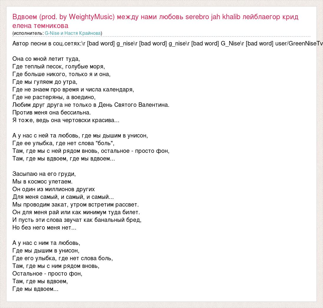 Автор песни в соц.сетях:\r [bad word] g_nise\r [bad word] g_nise\r [bad word] G_Nise\r [bad word] user/GreenNiseTv Она со мной летит туда, Где теплый песок, голубые моря, Где больше никого, только я и она, Где мы гуляем до утра, Где не знаем про время и числа календаря, Где не растеряны, а воедино, Любим друг друга не только в День Святого Валентина. Против меня она бессильна. Я тоже, ведь она чертовски красива... А у нас с ней та любовь, где мы дышим в унисон, Где ее улыбка, где нет слова "боль", Там, где мы с ней рядом вновь, остальное - просто фон, Там, где мы вдвоем, где мы вдвоем... Засыпаю на его груди, Мы в космос улетаем. Он один из миллионов других Для меня самый, и самый, и самый... Мы проводим закат, утром встретим рассвет. Он для меня рай или как минимум туда билет. И пусть эти слова звучат как банальный бред, Но без него меня нет... А у нас с ним та любовь, Где мы дышим в унисон, Где его улыбка, где нет слова боль, Там, где мы с ним рядом вновь, Остальное - просто фон, Там, где мы вдвоем, Где мы вдвоем...