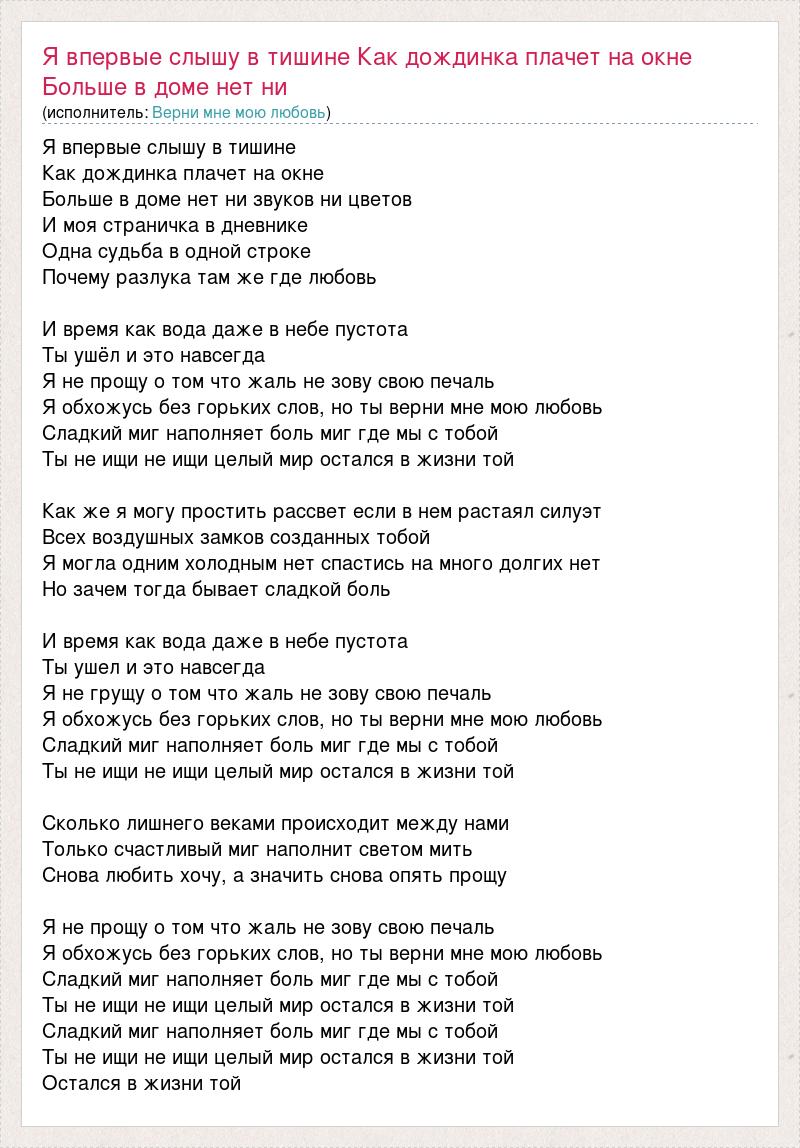 ГлавнаяИсполнителиВерни мне мою любовьЯ впервые слышу в тишине Как дождинка плачет на окне Больше в доме нет ни