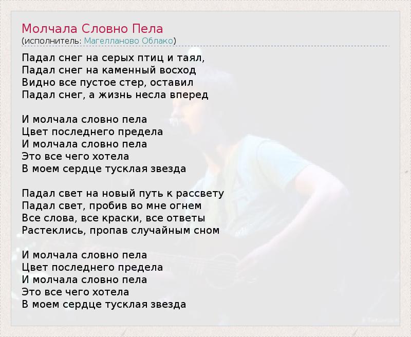 Падал снег на серых птиц и таял, Падал снег на каменный восход Видно все пустое стер, оставил Падал снег, а жизнь несла вперед И молчала словно пела Цвет последнего предела И молчала словно пела Это все чего хотела В моем сердце тусклая звезда Падал свет на новый путь к рассвету Падал свет, пробив во мне огнем Все слова, все краски, все ответы Растеклись, пропав случайным сном И молчала словно пела Цвет последнего предела И молчала словно пела Это все чего хотела В моем сердце тусклая звезда