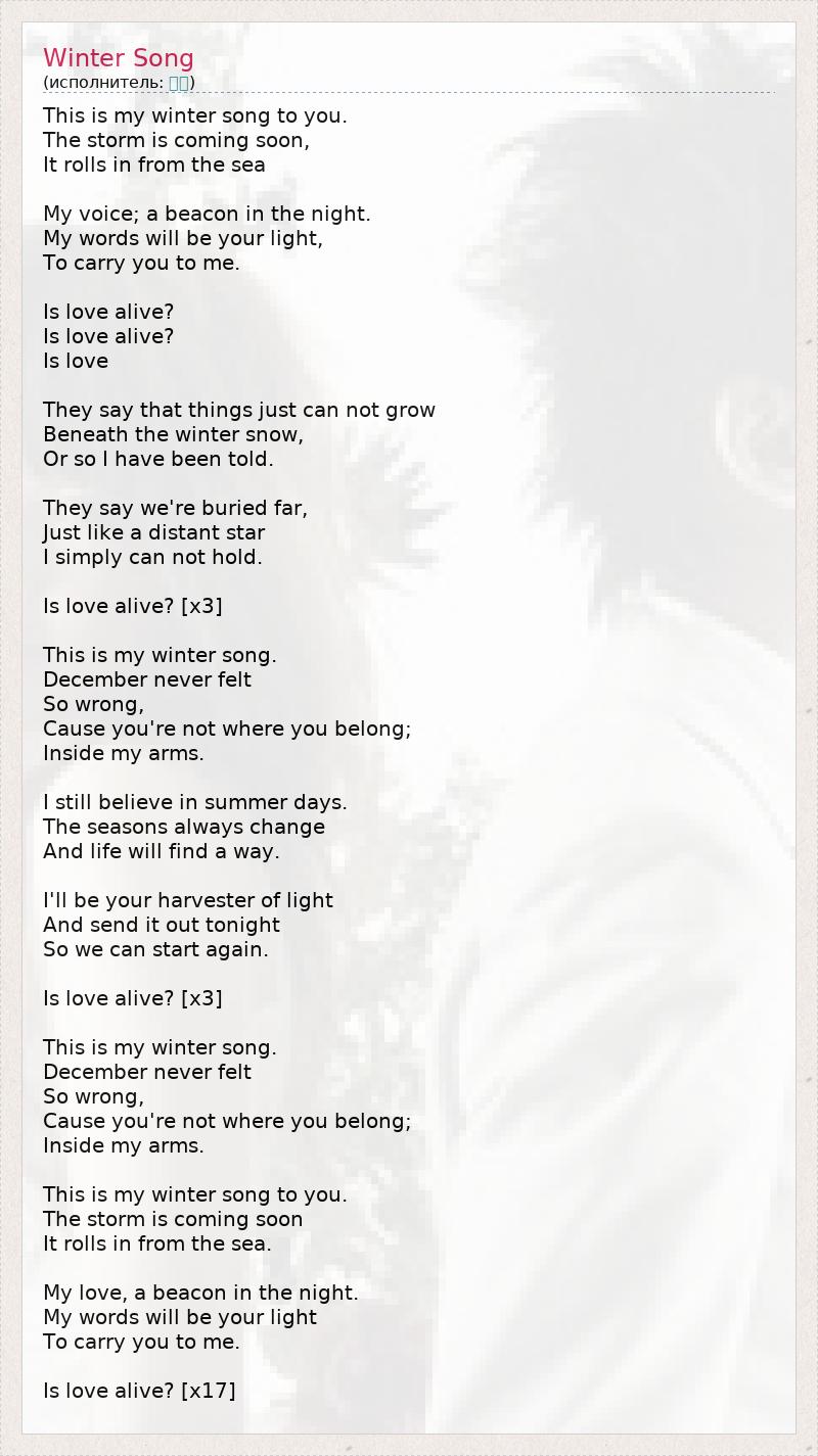 Это моя зимняя песня для тебя. Скоро начнется метель. Она катится с моря. Мой голос - маяк в ночи, Мои слова станут светом для тебя, Чтобы привести тебя ко мне. Любовь жива? Любовь жива? Любовь...? Говорят, ничего не может вырасти Под снегом зимы, Или так мне сказали. Говорят, мы скрыты далеко под снегом, Совсем как далекие звезды. Я просто не могу держаться. Любовь жива? [x3] Это моя зимняя песня. Декабрь еще никогда не казался мне Таким несправедливым, Потому что ты не там, где тебе место, - В моих объятиях. Я все еще верю в летние дни. Времена года всегда сменяют друг друга, И жизнь найдет путь. Я буду собирать для тебя свет И излучать его сегодня вечером. Так что мы можем начать заново. Любовь жива? [x3] Это моя зимняя песня. Декабрь еще никогда не казался мне Таким несправедливым, Потому что ты не там, где тебе место, - В моих объятиях. Это моя зимняя песня для тебя. Скоро начнется метель. Она надвигается с моря. Моя любовь - маяк в ночи, Мои слова станут светом для тебя, Чтобы привести тебя ко мне. Любовь жива? [x17]